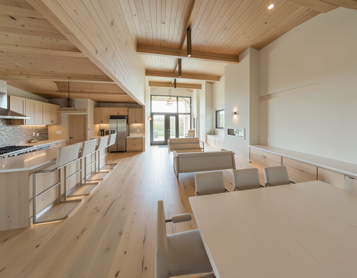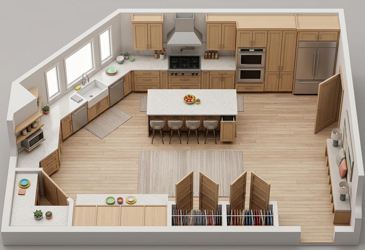 show me a kitchen with this floor plan and slim profile black shaker cabinets with white quartz countertops