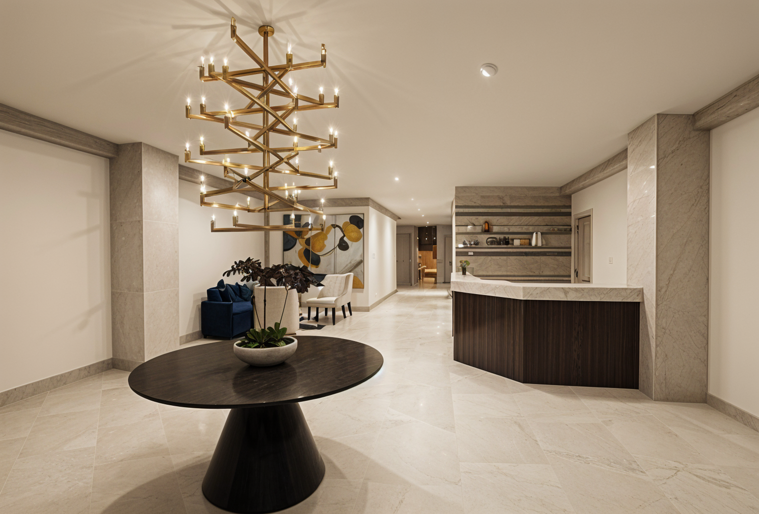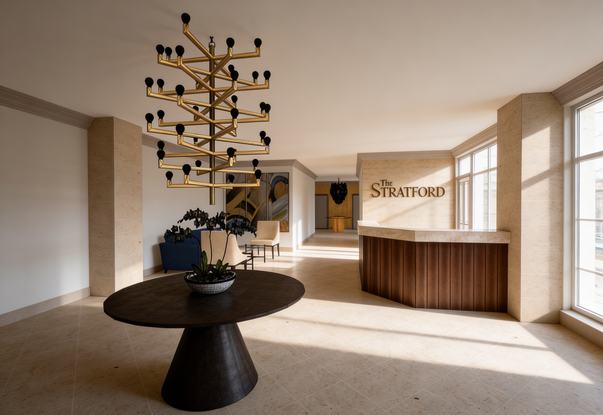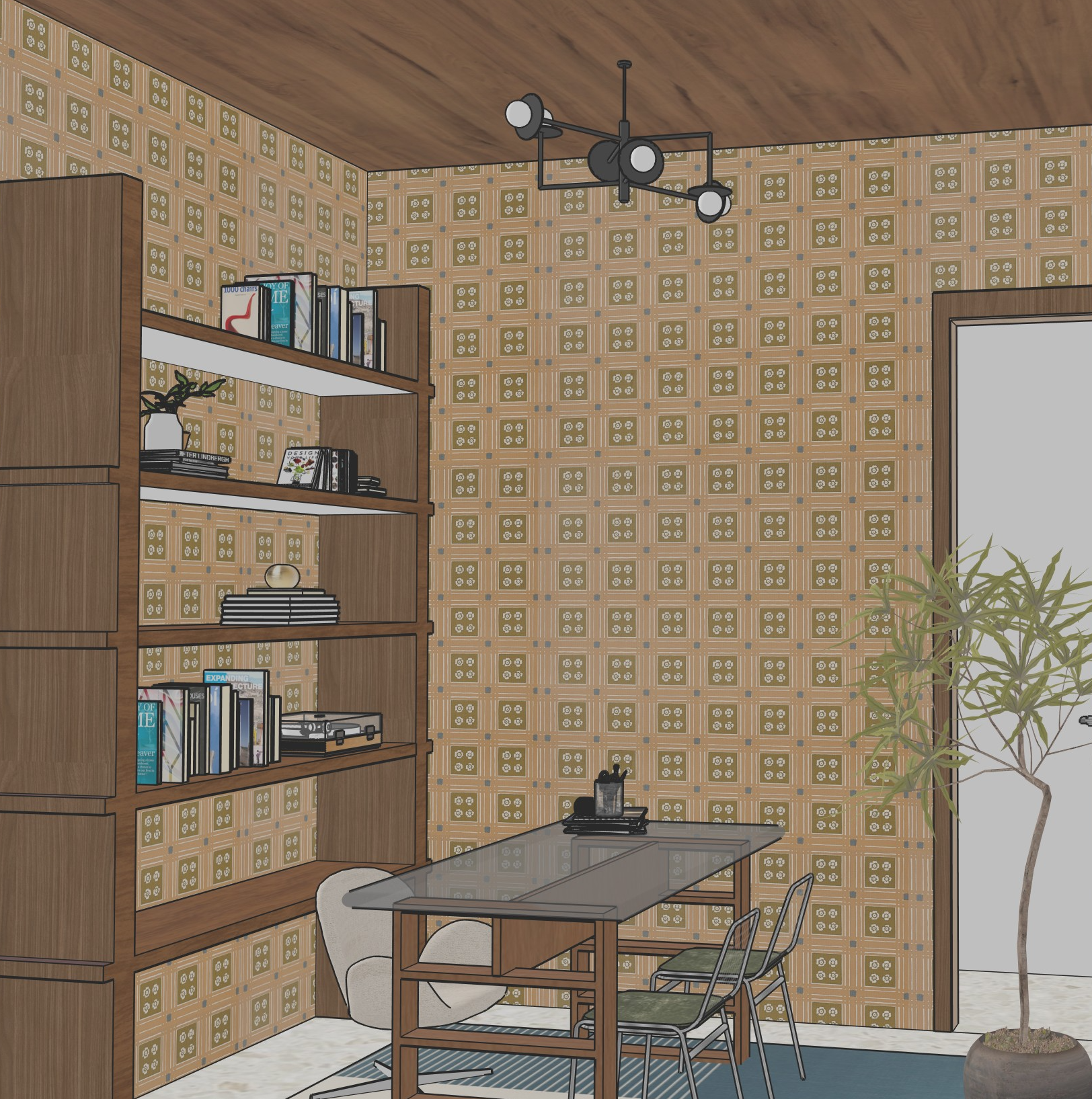 generate an image of a skylight the ceiling should be a walnut wood panel and on the outside of the skylight blue skies and palm tree leaves