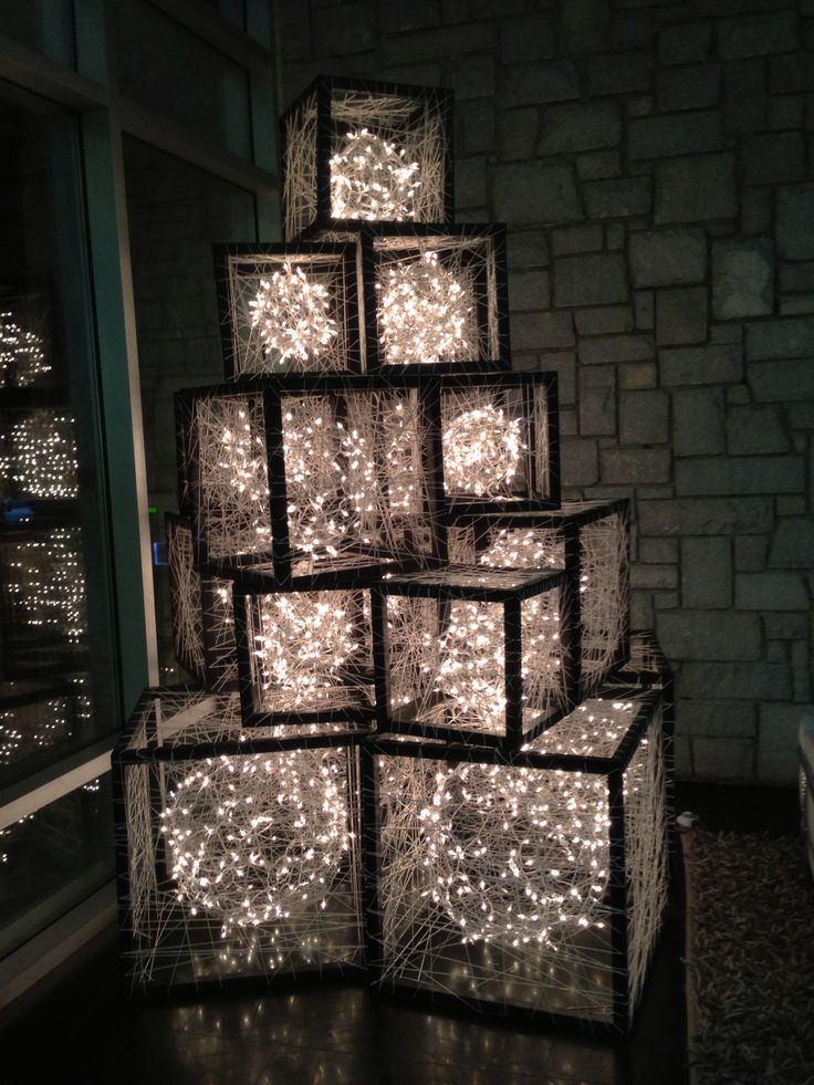 there is a christmas tree in this picture this christmas tree is made out hollow cubes the hollow cubes are woven on several sides with red white and gold yarn make it realistic i want a white backround make it in the daylight