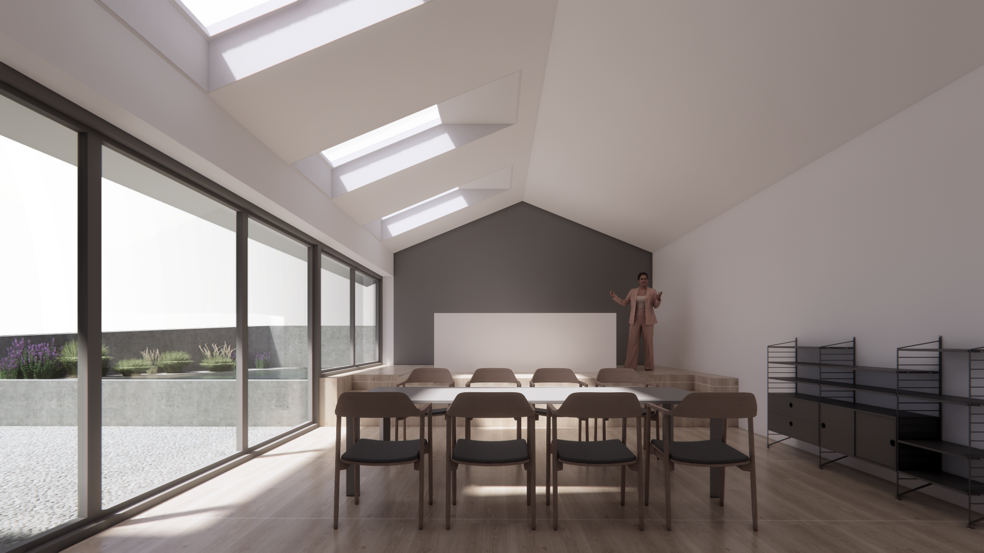 outside the window is a garden there is sunlight realistic rendering the furniture should be modern design classics the area at the background in the room is a kitchen