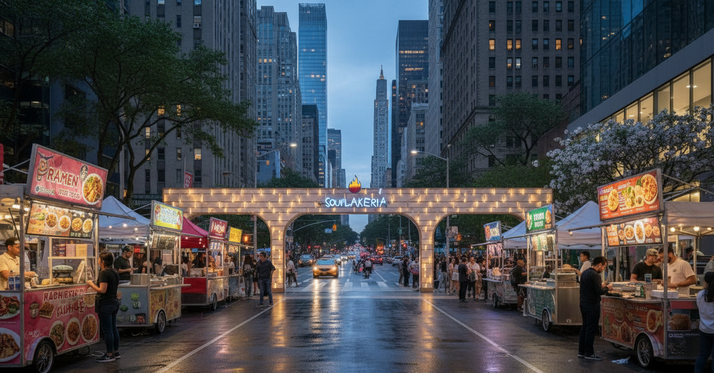 place inmiami road beatch down town it next to other food pop up stores along a large commercial and street fooding street on the side of the street along the road or the sidewalk like all the other stores the view should be perspective