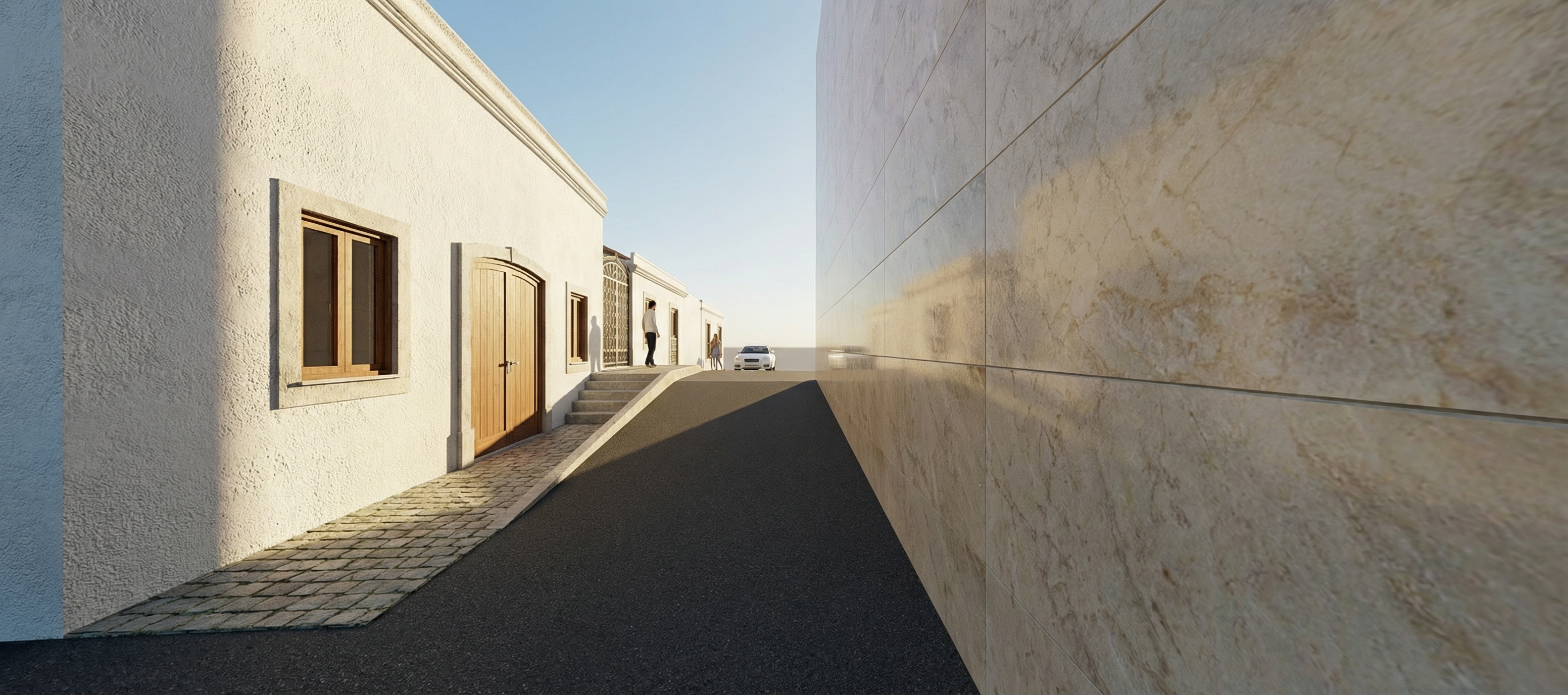a modern two story with a combination of lp smartside horizontal lap siding in benjamin moore silhouette on the upper walls as shown and lp smartside board and batten in benjamin moore silhouette on the bottom as shown westform prolok vertical metal in ponderosa color on front door entry wall stacked cultural stone in a light complimenting color on the bottom 3 of garage walls as shown black garage doors with windows across the top of each door front door is full glass framed in black black standing seam metal roofing black fascia and black metal soffit exposed natural timber beams supporting both garage roofs retain the exact structure window arrangement beams rooflines height and proportions exactly as shown in the reference image add a smooth concrete front driveway extending toward the house garage doors and a walkway from the driveway to the front door and the side garage door bronze tinted reflective windows enhance materials and colors keep exact window structure arrangement beams rooflines and proportions exactly as shown in the reference image soft interior lighting inside the home creates warmth the home a hanging chandelier over the interior stairs is partially visible through the large window beside the door in the distance is a golf course around the property is a few sparse mixed evergreens and hardwoods place the sun behind the trees so warm golden sunlight beams through the branches casting soft rays and subtle dappled highlights across the front of the home create ultra realistic lighting crisp shadows detailed textures in the wood and glass reflections and a vibrant clear sky with light atmospheric depth render in hyper realistic architectural visualization quality 8k resolution