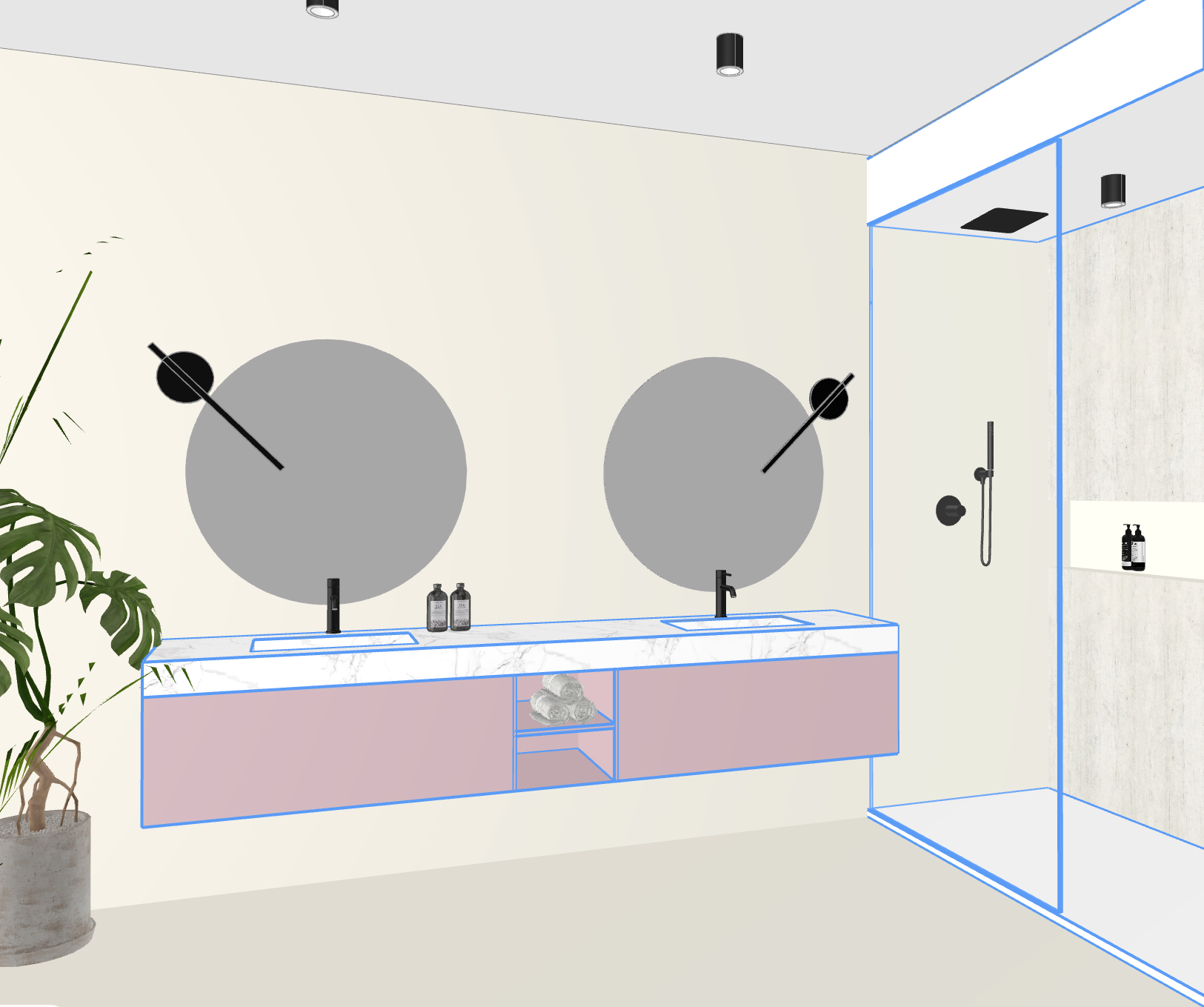 photorealistic interior render of a modern minimalist bathroom maintaining exact proportions and layout from the reference image the scene features a double vanity with a floating cabinet in a soft dusty pink tone topped with a light marble countertop with subtle veining two integrated sinks with black faucets are centered under two large round mirrors each mirror has a soft backlight diffused led glow 4000k neutral white and is intersected by a thin black linear wall lamp baton style also illuminated at 4000k the lamps cross the mirrors asymmetrically and must appear sleek and minimal natural daylight enters from a window on the left side of the room casting soft realistic shadows across the space the lighting should feel natural balanced and slightly directional from left to right on the right side a walk in shower with a clear glass panel the shower wall is finished in a light textured concrete or stone effect inside the shower a horizontal recessed niche with integrated led backlighting 4000k matte black shower fixtures rain shower head hand shower the ceiling features a lowered gypsum board plasterboard structure with recessed spotlights all turned on 4000k continuous led strip lighting hidden in ceiling grooves along the perimeter where walls meet the ceiling soft indirect light 4000k walls are in a warm neutral beige tone enhancing a calm and elegant atmosphere floor in light neutral tone seamless and minimal style contemporary clean refined high end italian interior design materials must look realistic no plastic effect with correct light reflections and soft shadows camera positioned at human eye level slightly angled to capture both vanity and shower area no distortion of geometry no added elements keep composition faithful to the original design