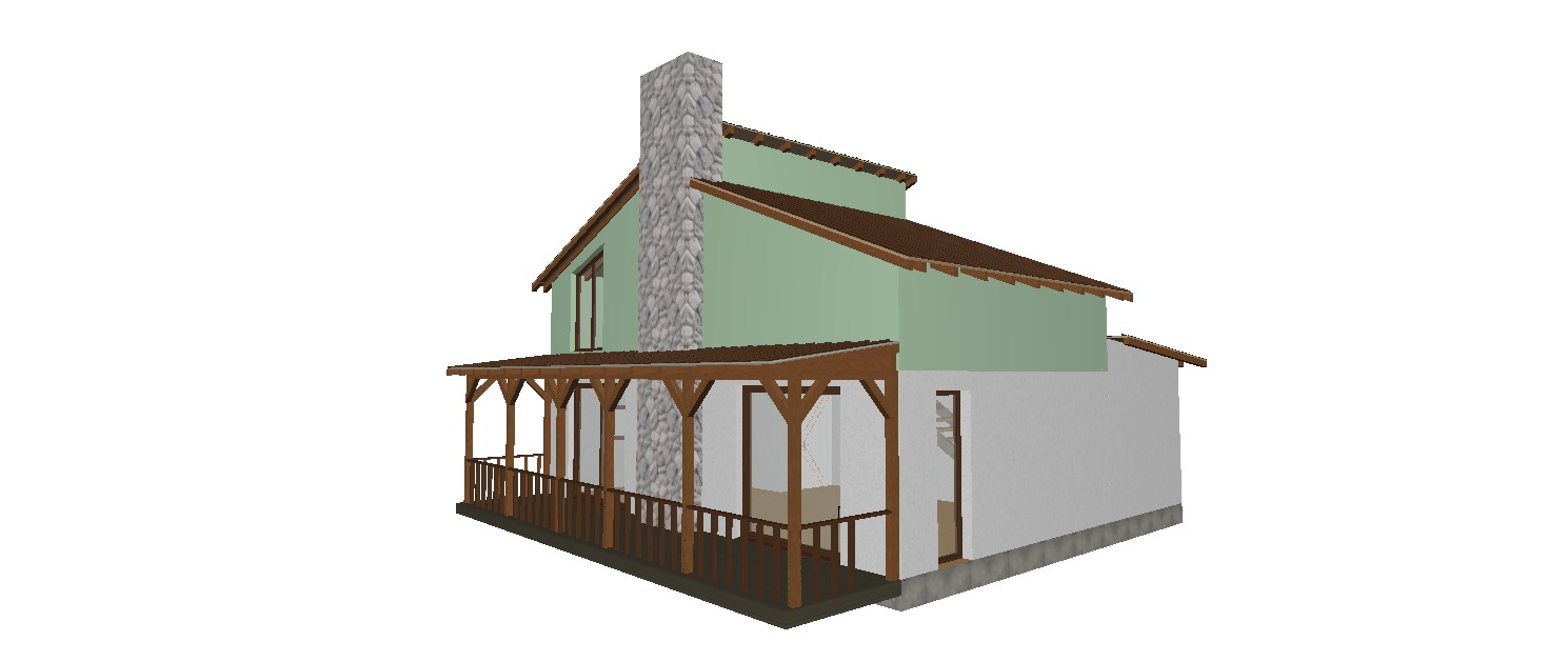 ultra realistic architectural visualization of a small residential house keeping exactly the same proportions massing roof geometry and camera perspective as the reference image the upper facade is finished with vertical wooden cladding boards 200 mm wide painted in a muted olive green color the ground floor facade is a clean white etics demit plaster finish smooth and minimal the roof is made of trapezoidal metal sheets with the same color and tone as shown in the reference image including metal window sills and metal gutters all in the same matching color windows and doors are pvc joinery finished in the same color as in the reference image with realistic reflections and correct proportions the terrace structure and decking are made of natural wood finished in the same warm brown tone as shown in the reference image with visible wood texture the chimney is clad in natural river stone with irregular texture and realistic stone pattern the terrain is flat and level naturally integrated with the building add subtle landscape design around the house low grass lawn modest flower beds with plants typical for the local climate lavender ornamental grasses hydrangea seasonal flowers and a few medium height deciduous trees placed naturally around the plot the house is located near a river suggested only through lush vegetation and a slightly humid fresh atmosphere without the river being visible in the scene include a simple access pathway leading to the main entrance made of concrete or stone slabs clean and functional soft natural daylight realistic shadows high material accuracy physically based rendering high resolution ultra realistic textures calm warm and inviting mood add man and woman sitting on the porch in chairs and drinking beer