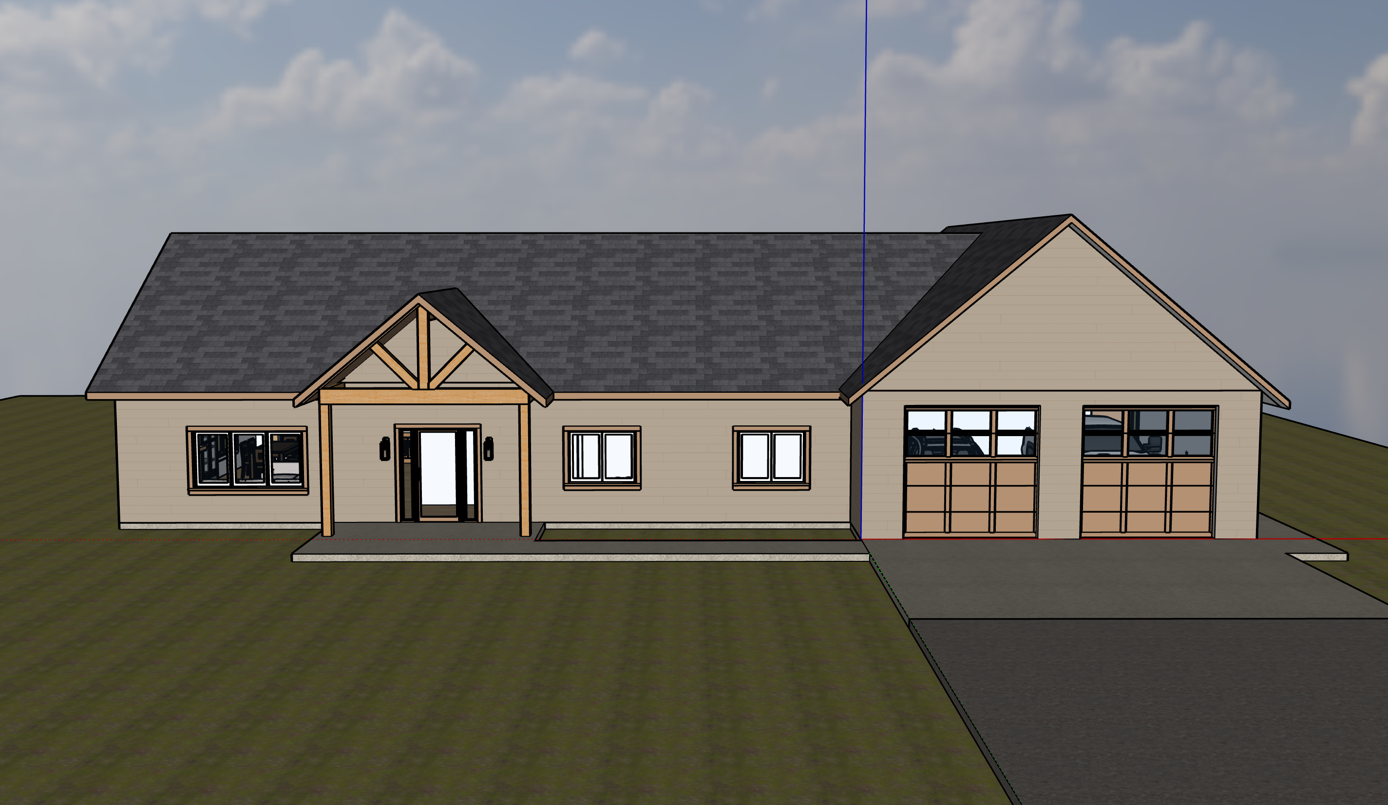 located in a natural field trees in the back 40 and somewhat on the left side mowed lawn around the house we re looking at the front of the house front of the house faces north so the sun should be shining from the back and shading the front slightly make it look realistic maintain architectural details all siding should be james hardie cedarmill horizontal lap siding black garage doors white window frames no window grids gravel drive in front of a brushed concrete driveway apron front entry patio and front walkway window trim matches body color of home make sure garage door glass is maintained make white windows appear fairly muted not popping out make doug fir timber framing stain color medium dark front patio cover is vaulted inside with no siding out at the gable mid century modern sconces by front door and by garage doors