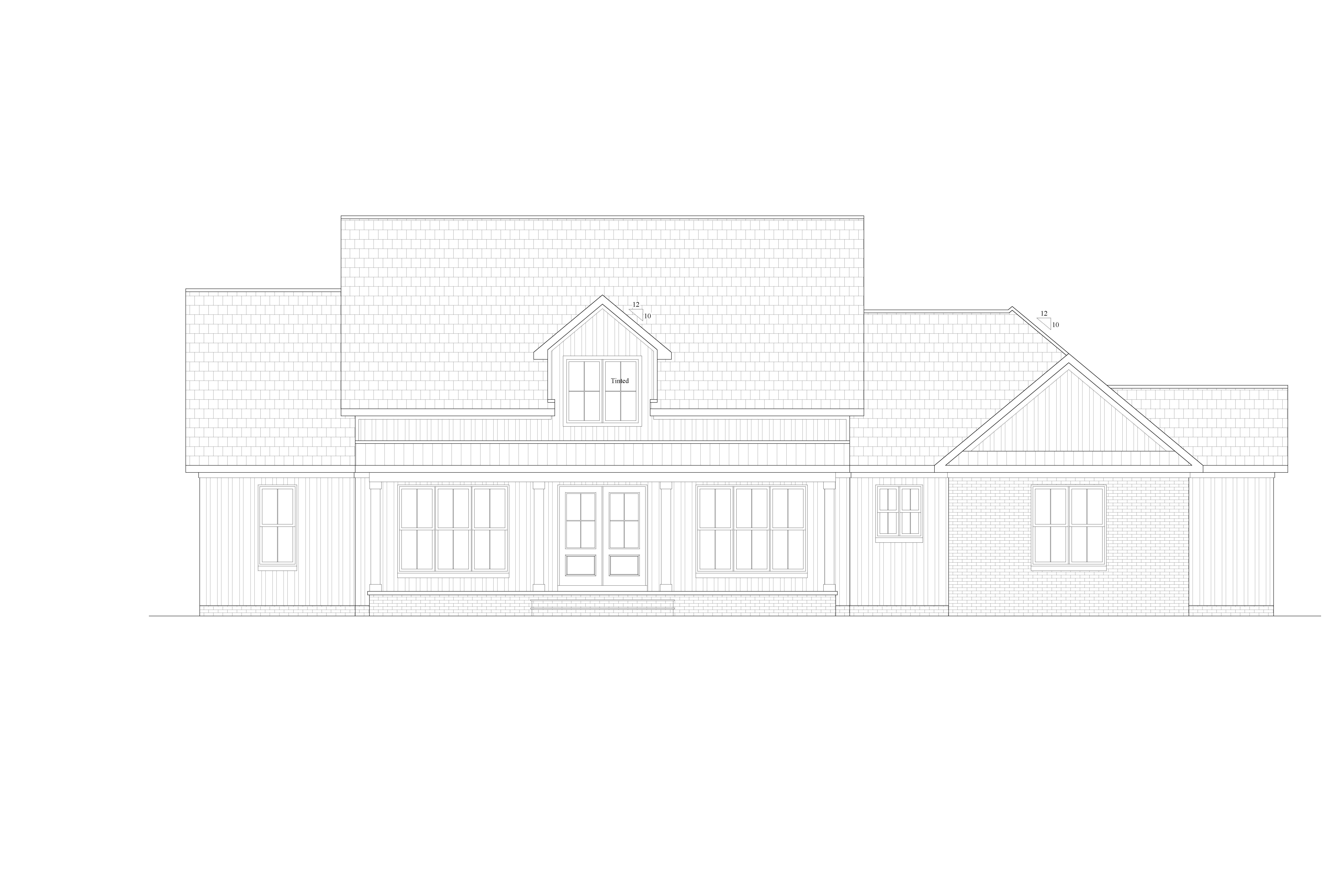 black shingle roof black metal porch roofing black windows black trim dark grey brick foundation with black mortar wood porch posts and beams wood front door iron ore board and batt siding