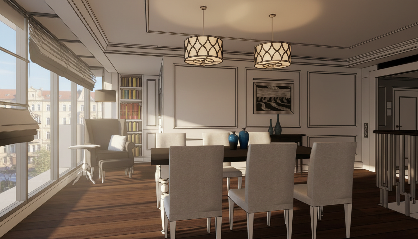 international style interior shot create a nice realistic interior visualization use natural materials and maintain correct scale and proportions use physically accurate lighting with soft global illumination and high quality textures ensure precise details with realistic reflections and shadows the lamps are turned on and emit warm light with visible light sources keep natural exposure do not add stylization or artistic effects the result must be photorealistic architecture