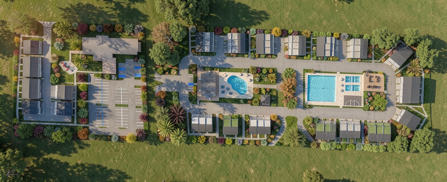 make a fully rendered master plan and continue adding realistic native georgia planting in the grass areas do not touch the blue parking spots they are handicap spots also make the pool look detailed in the center but leave the blue tennis courts on the right alone also use more oaks throughout