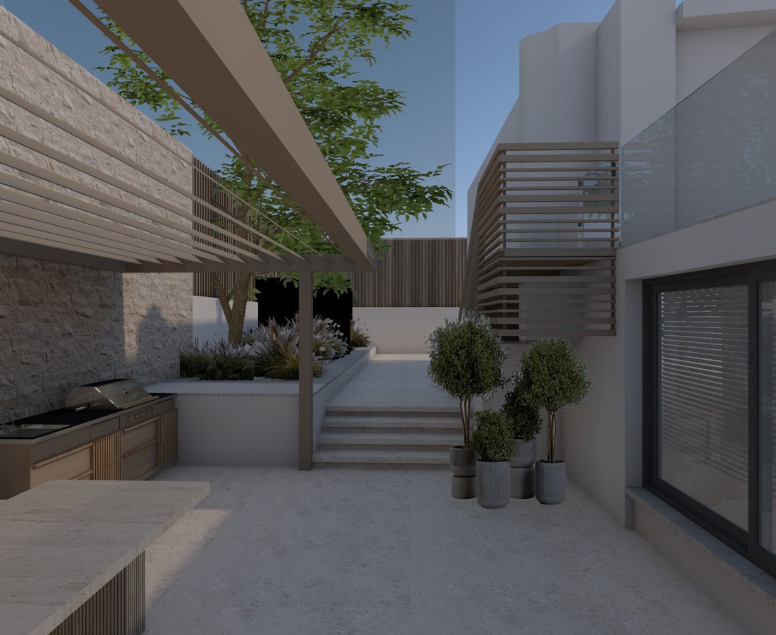 a calm elegant contemporary outdoor courtyard with a minimalist architectural language the scene features a decorative screen made of beige slats creating a refined semi transparent partition and adding rhythm depth and visual lightness to the composition the surrounding walls are smooth warm white plaster keeping the palette soft and understated lighting should be soft and natural like late afternoon daylight with gentle shadows and a calm luxurious mood the final render should look refined realistic and architectural with strong material clarity and a high end design feel grey aluminium glass light beige color at the walls the railing of the stair is also beige nice sky keep the geometry as it is in the planter back on the left spike lights are integrated within the pebbles directing a soft focused light onto the plants enhancing their volume and texture also skeep the black rectangular on the back stone on the wall on the left