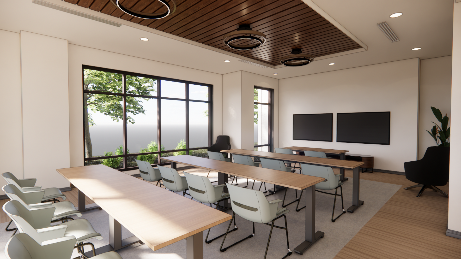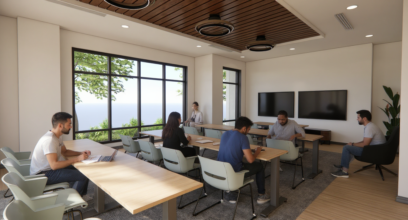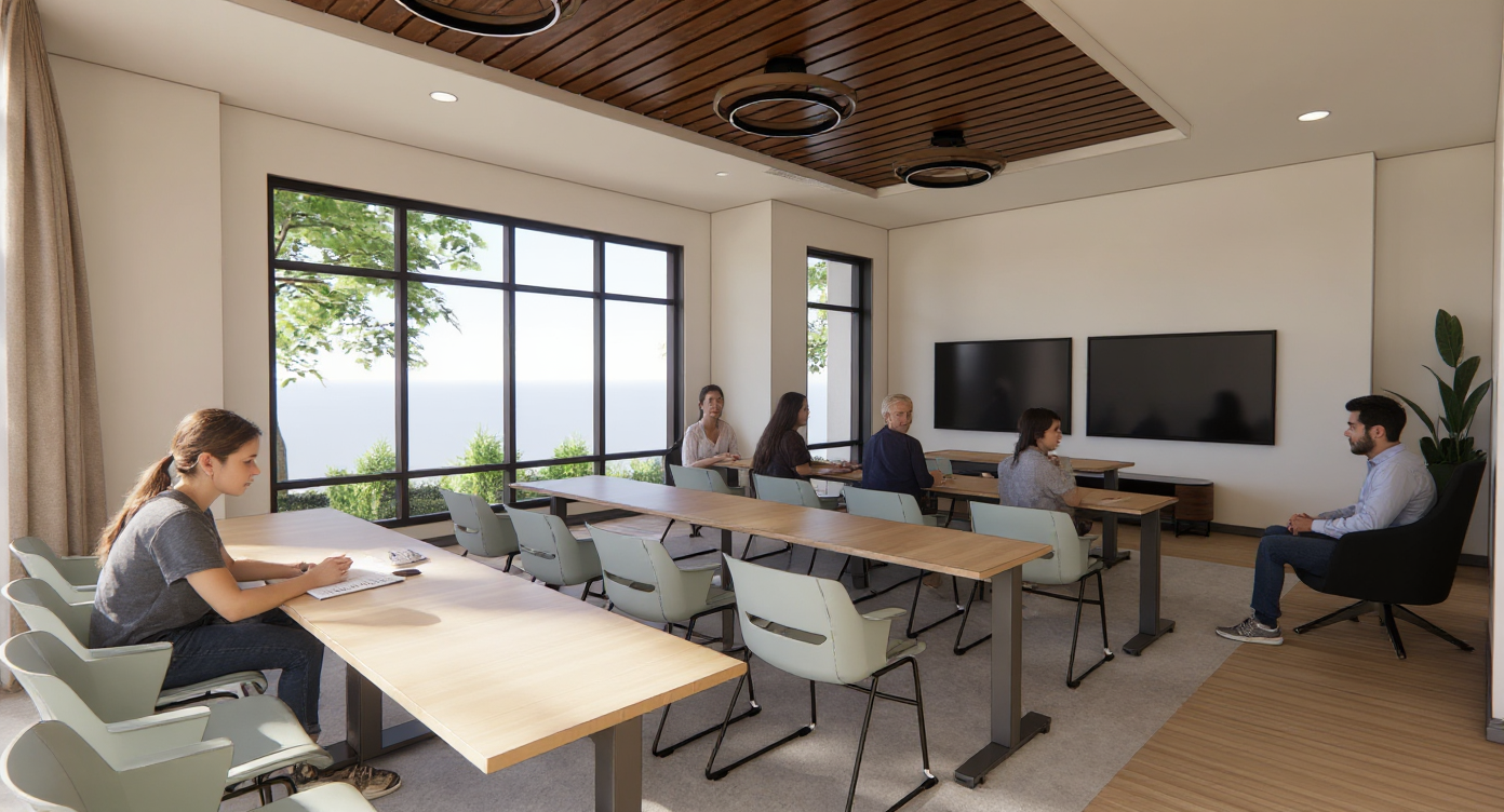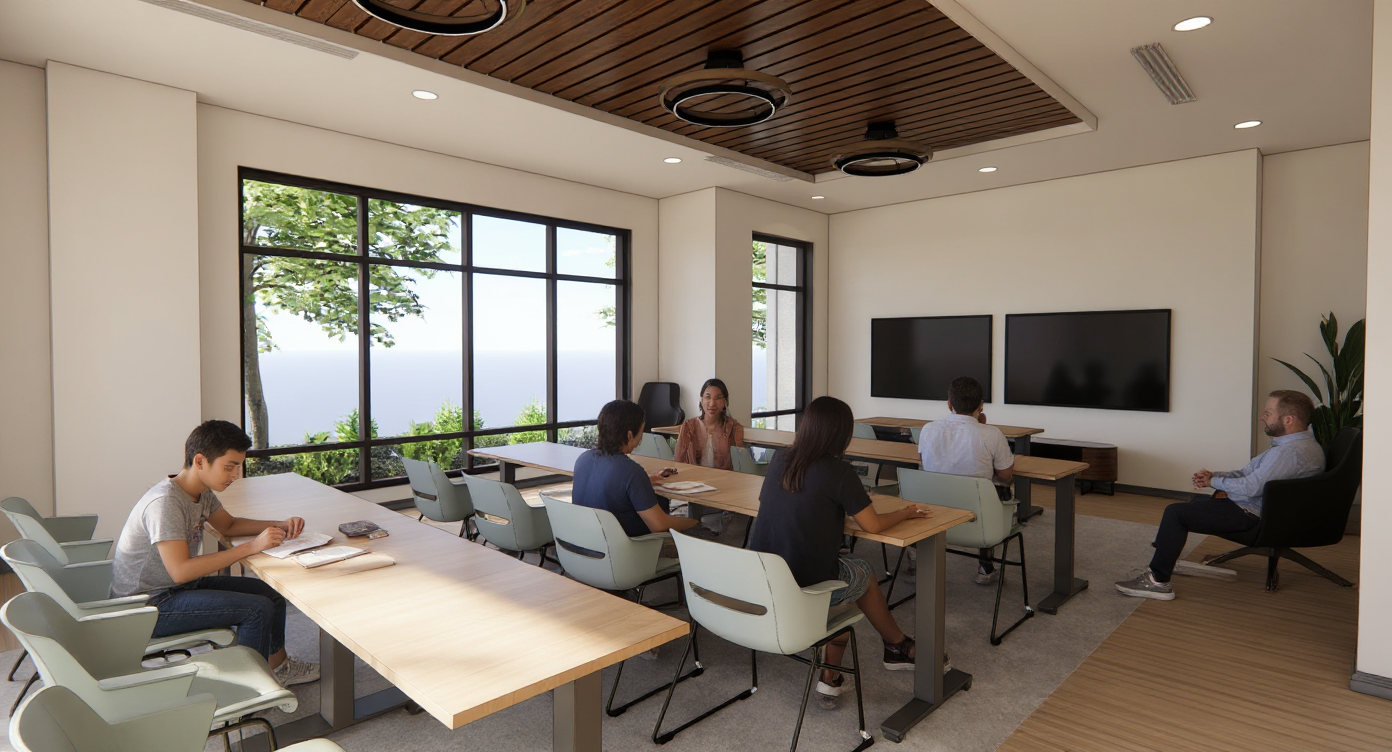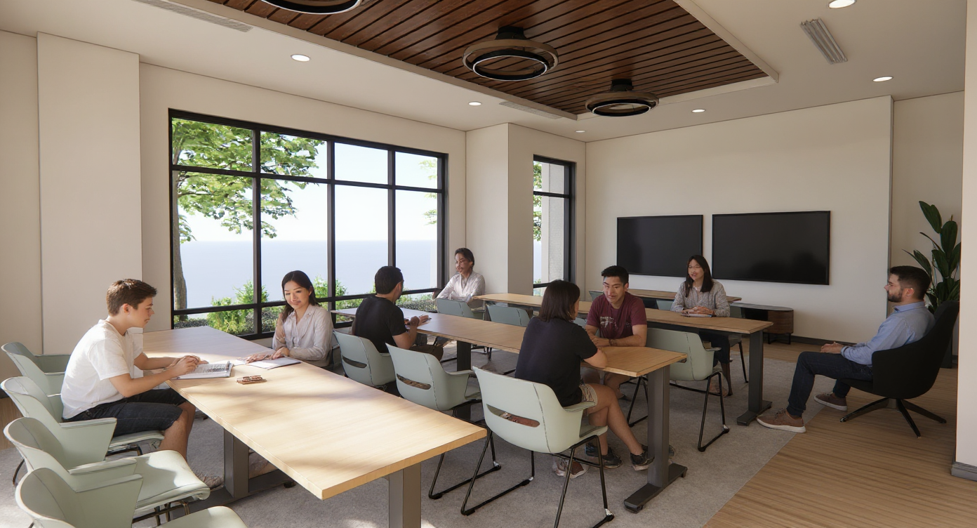 show more diversity in the people maybe a kid doing homework at the table and diversity in the people using the space facing the other direction