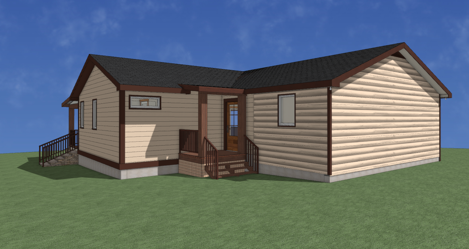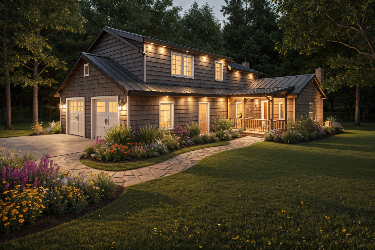 add a background of a lake add walkway on the left side of the house and basic landscaping