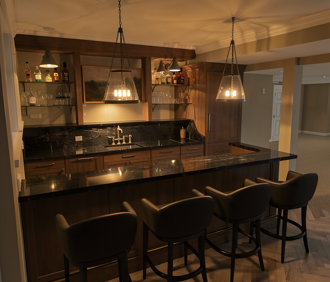 render a modern interior with a warm sun drenched feel the ceiling is a medium walnut the walls are a soft cream color the cabinetry is a light oak all joinery is finger pull the floor is a medium oak wood the stone on bench tops island and splash back is a light travertine the overall atmosphere should feel inviting and sophisticated