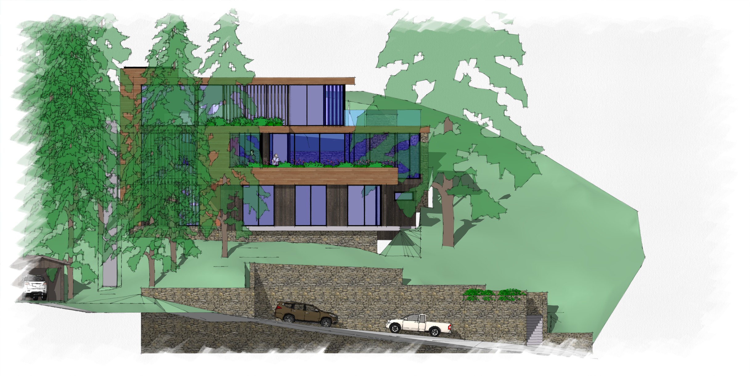create a serene wooded forest scene with a modern three story house nestled among tall evergreen trees use a natural color palette deep green for the trees warm brown for the wooden accents of the house dark brown wood accents and neutral stone gray for the retaining walls the house has large windows reflecting the clear blue sky the atmosphere should be peaceful and inviting with soft sunlight casting gentle shadows add a slightly misty atmosphere