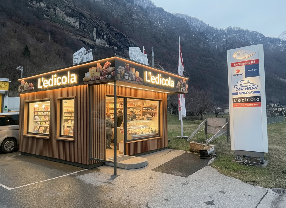 clad the construction in irregular vertical wood open the windows show the interior where shelves display artisanal food products place some people inside use indirect lighting both interior and exterior add external decorations of items for sale put the name l edicola dell artigianato on the upper band on a black background