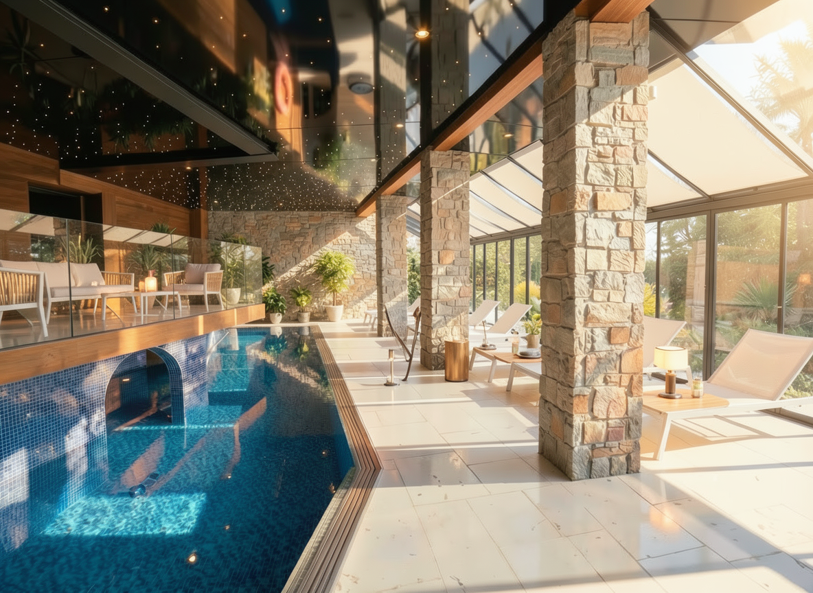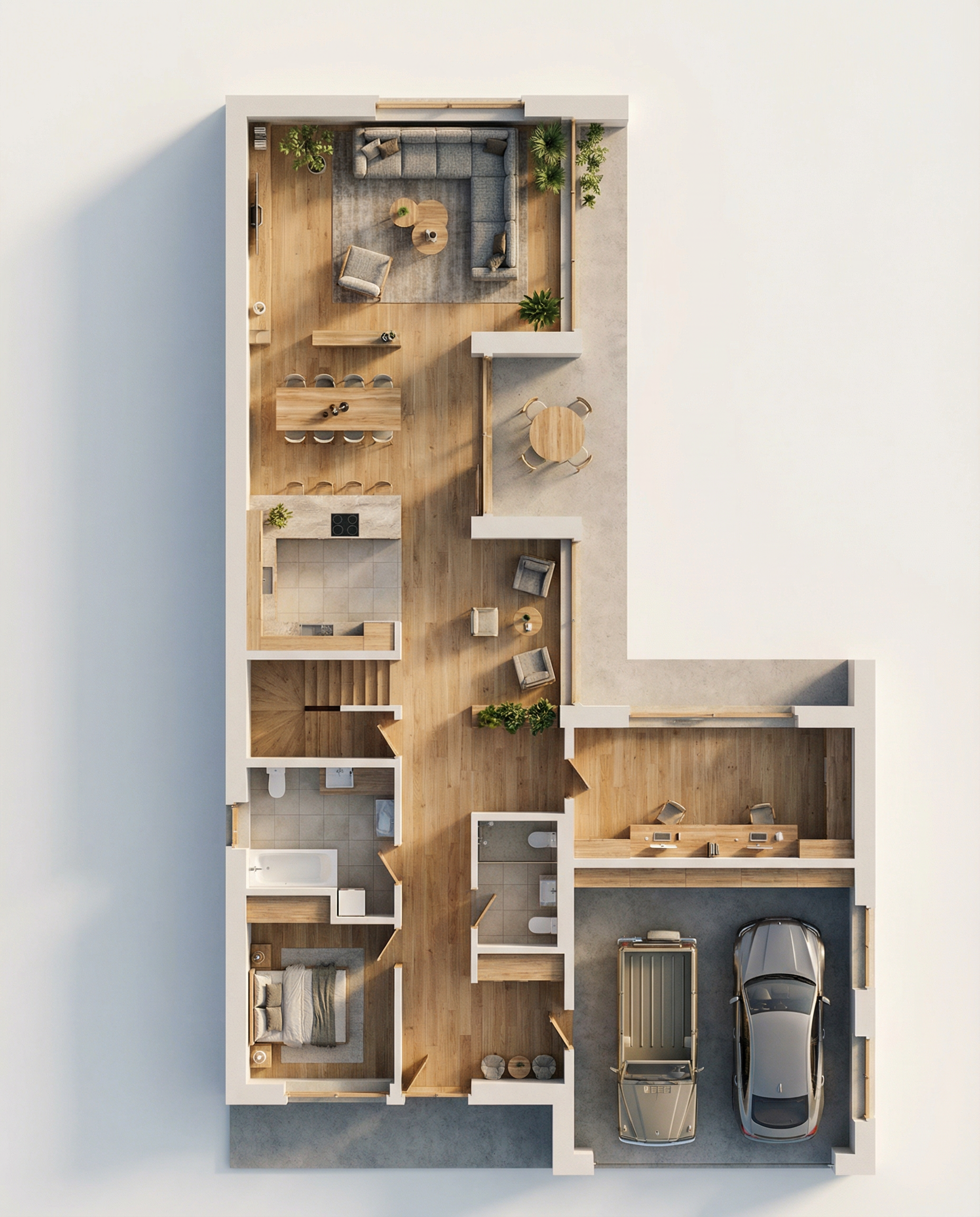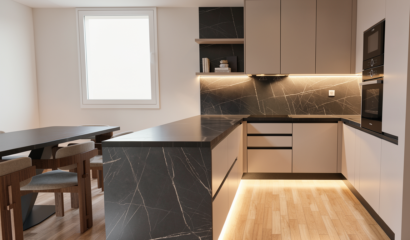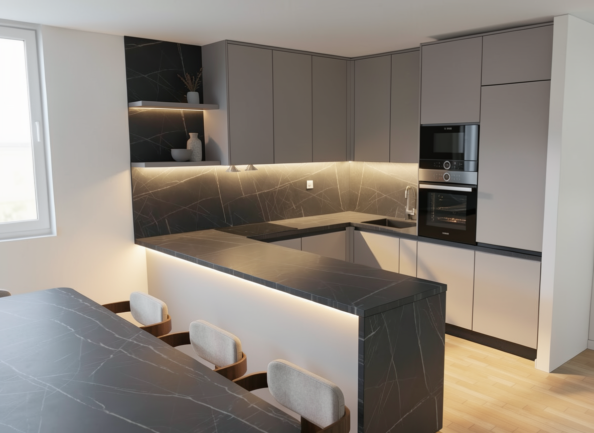 everything is matte including the table and worktop underneath the above elements is led lighting there is no led lighting under the shelves there is no lighting at the bottom of the kitchen