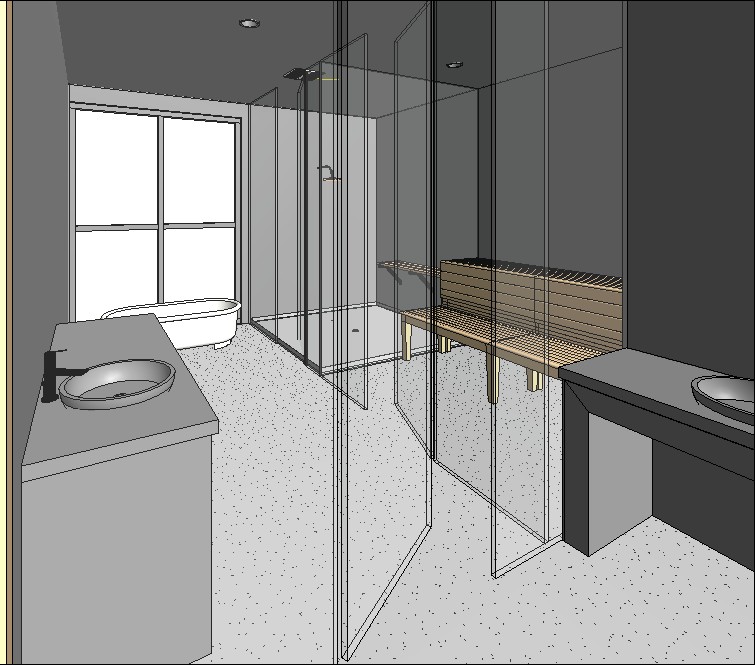 pale taupe colored tile walls in shower and on floor the sauna with wood bench has matching wood walls and floor the window looks out to a tropical bay with palm tree neaby and sun setting in disatance
