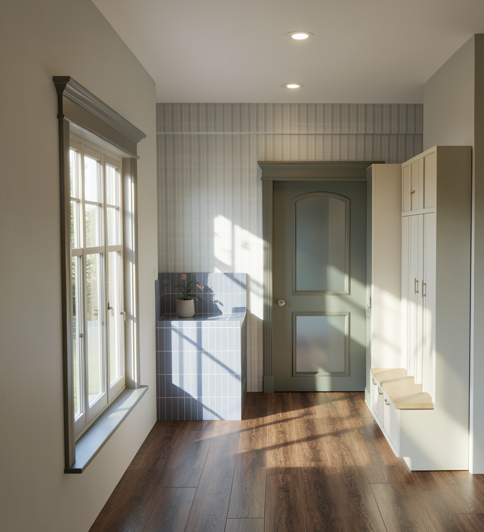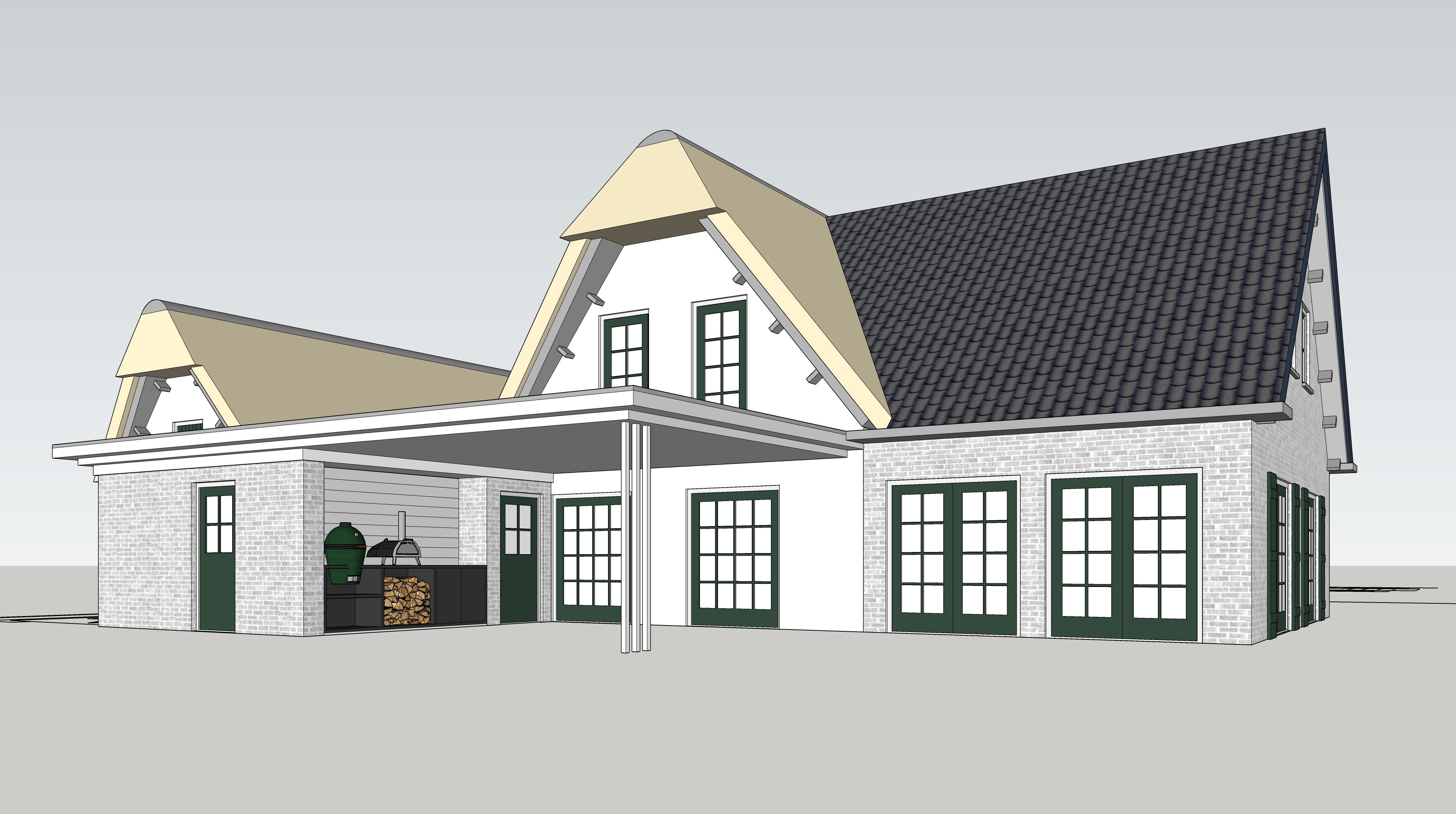add trees and flowers add people add a table with chairs for 8 persons under the canopy