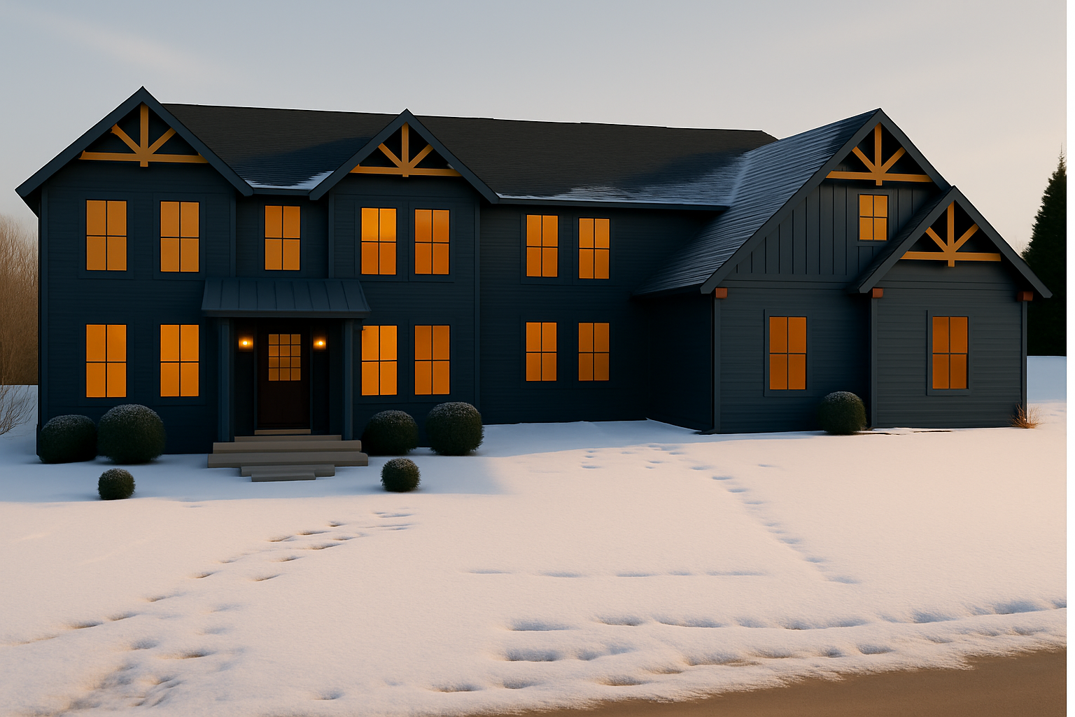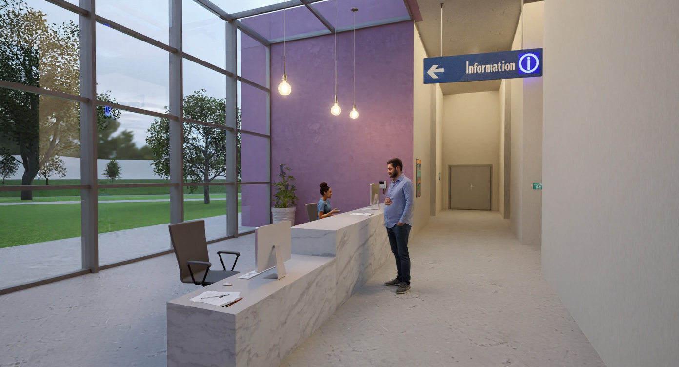 add lighting on the left side of the building and a pink senic painting on the wall that is on the right