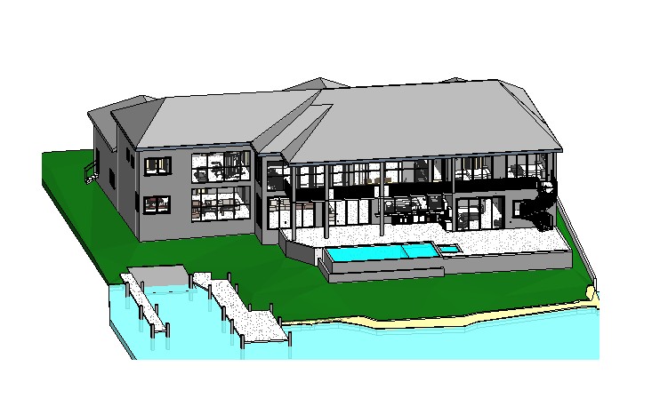 modern luxurious bayside house with an expansive design featuring a sleek white roof and exterior walls large windows reflecting natural light the surrounding lush vibrant green lawn complements the structure leading to a crystal clear turquoise pool and azure bay a concrete dock extends over the serene water bathed in soft golden sunset hues the atmosphere is peaceful and inviting with a clear blue sky and soft warm lighting casting gentle shadows emphasizing the architectural elegance and tranquil setting architecture