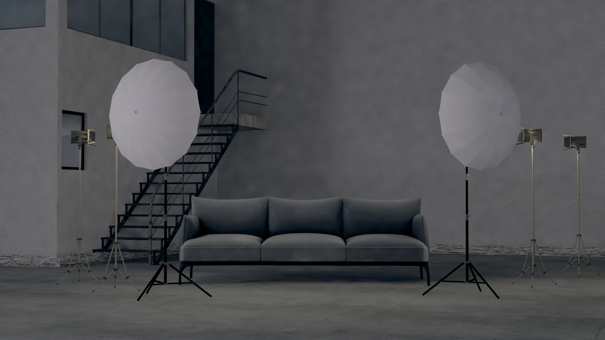 cinematic light with fog a ll the walls in gray the floor is of concrete all are cinema reflector