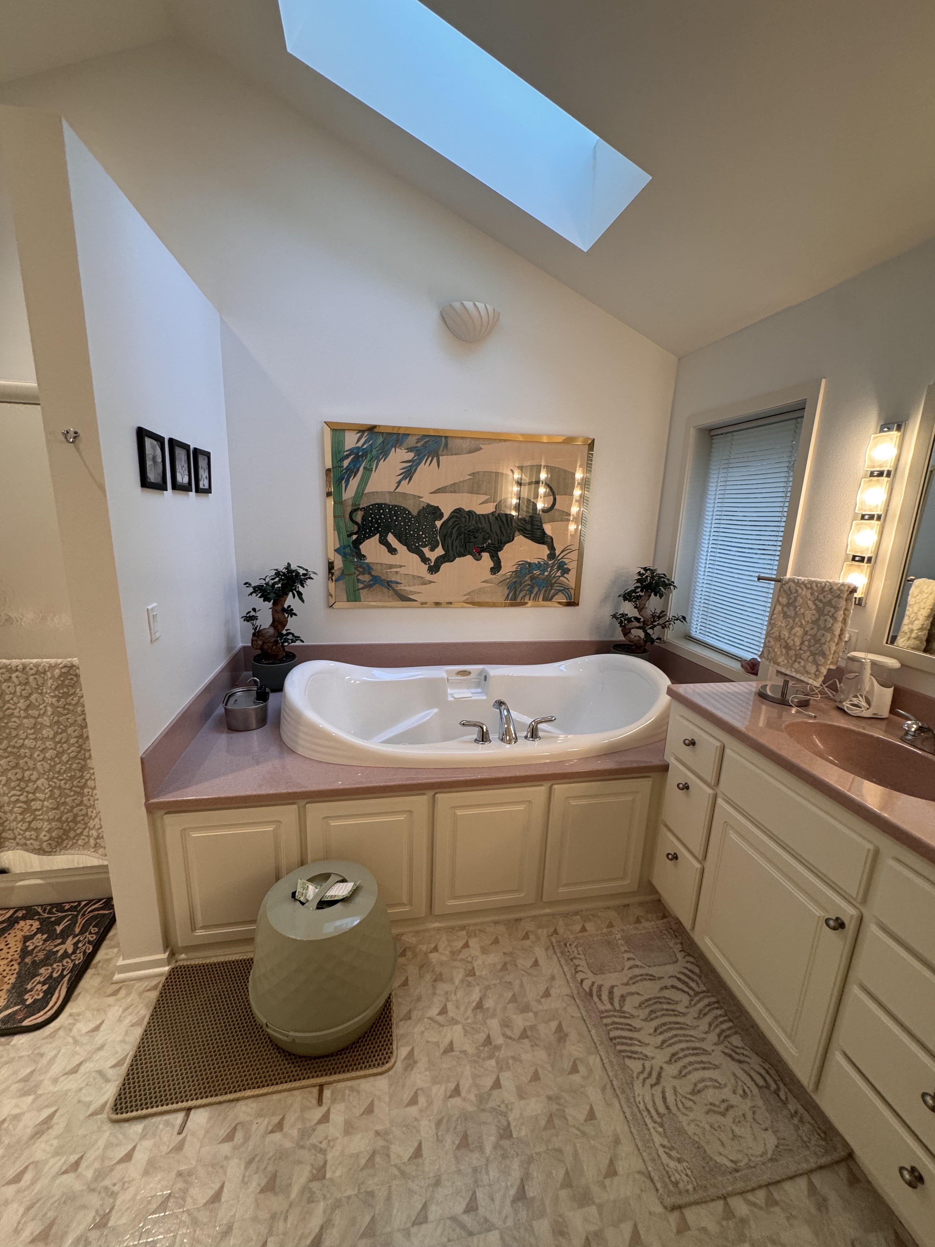 use the existing bathroom photo as the base image remove the pink countertop and replace with a luxury quartz countertop soft warm white base subtle veining calacatta style not busy 2 3 cm thickness with eased edge cabinets can be painted choose a rich elegant color that adds depth deep green warm taupe or soft charcoal refined not trendy paint walls in a complementary neutral that feels soft and elevated warm white light greige or muted stone tone replace all hardware and plumbing fixtures with brushed brass frame mirrors in thin brass frames replace lighting with elegant vertical brass sconces turn all lighting on with warm glow 2700k feel replace flooring with neutral small to medium format tile warm taupe limestone look or subtle stone texture not gray not cool toned remove clutter remove trash can remove cat litter box and rug keep artwork above the tub remove light from wall from left of tub paint the walls green same as cabinets add brass light to above the painting on back wall