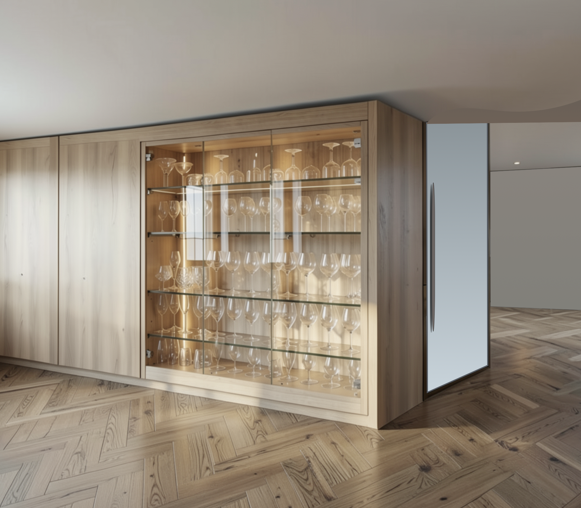 make cabinetry light matte walnut and floors herringbone add round dining table behind glass door