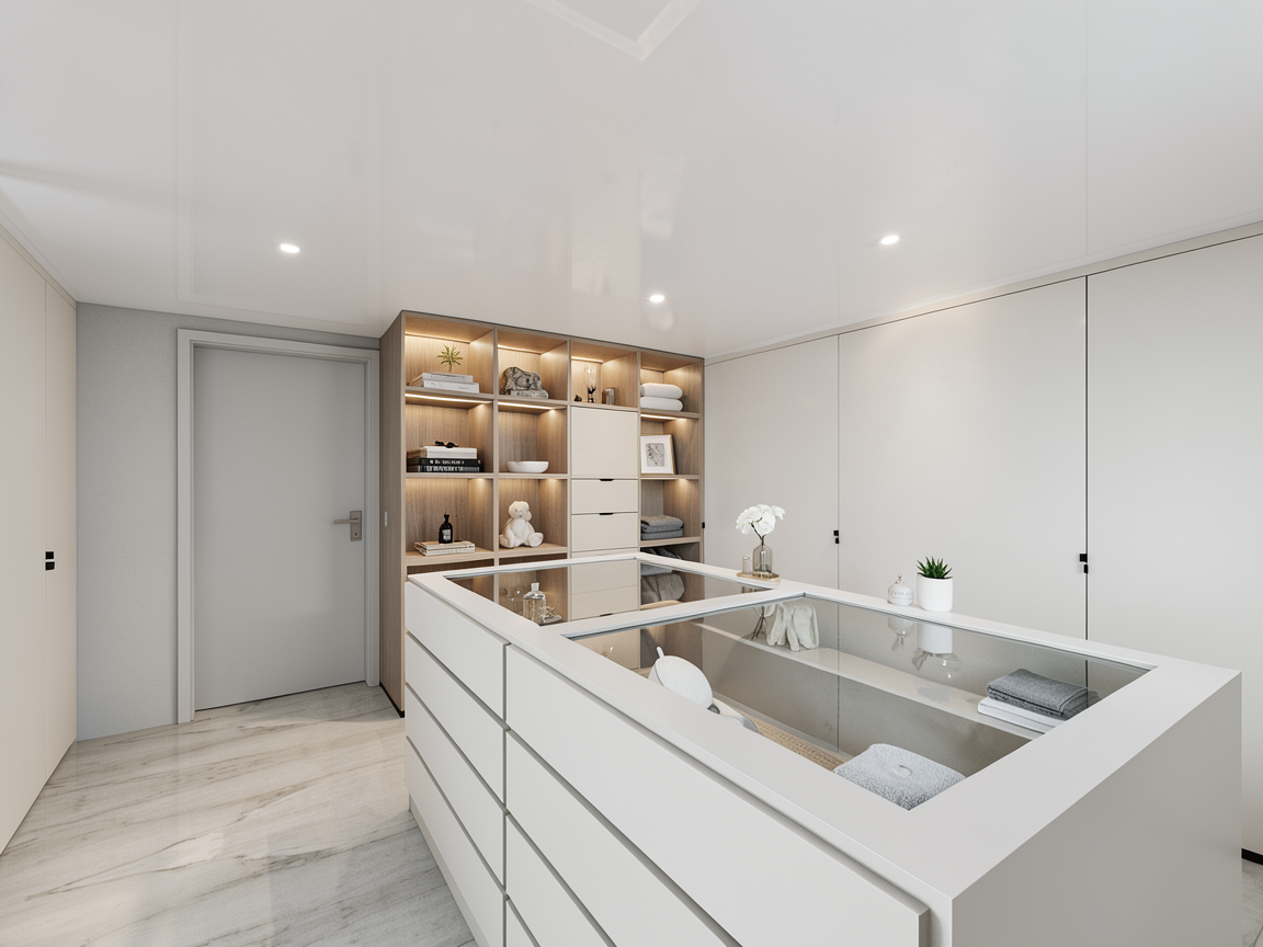 make more realistic rift white oak cabinets with reeded lower cabinets make the mirror a window
