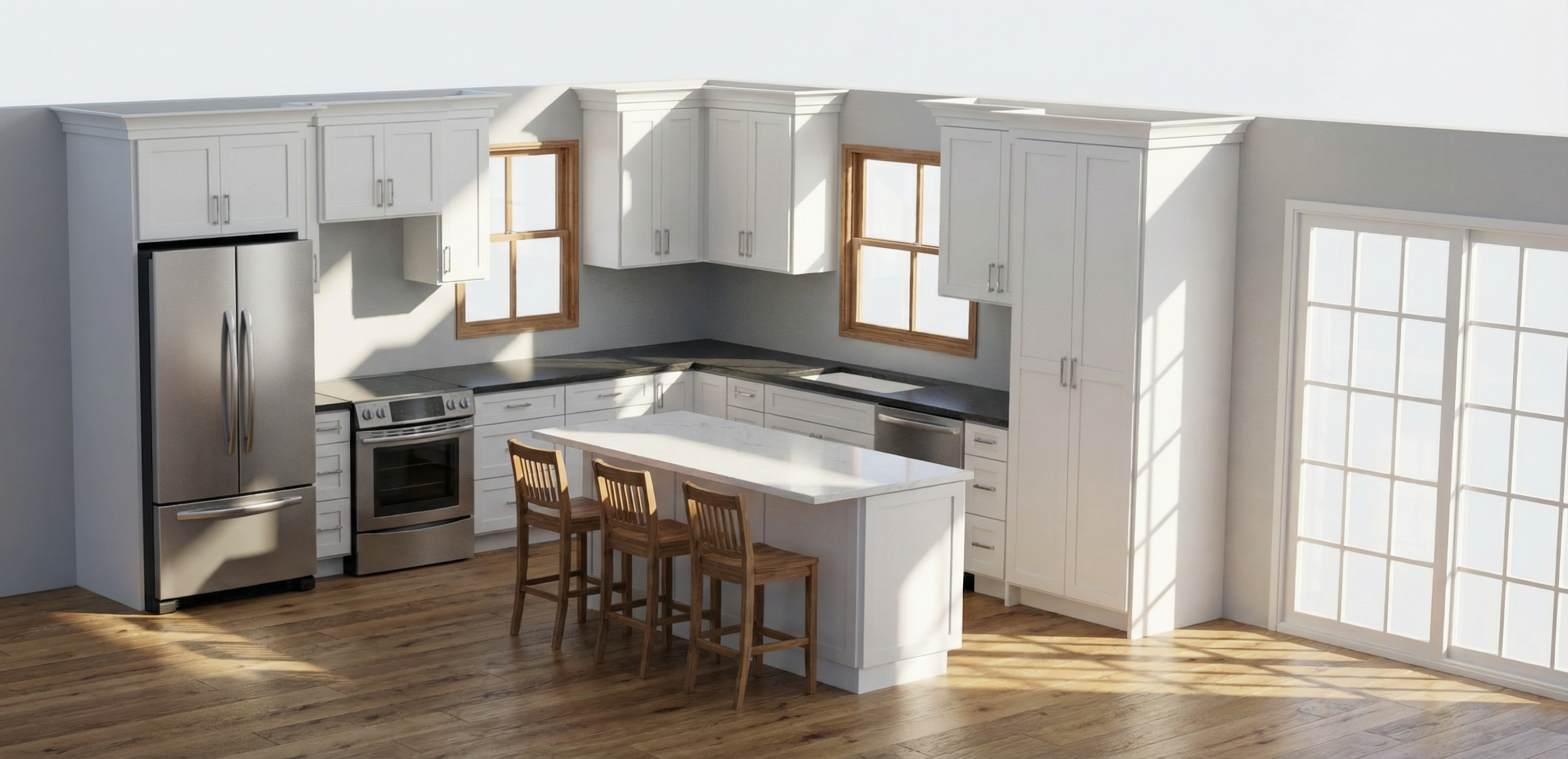add realistic textures do not change the composition whithe background no trees shadows glass doors