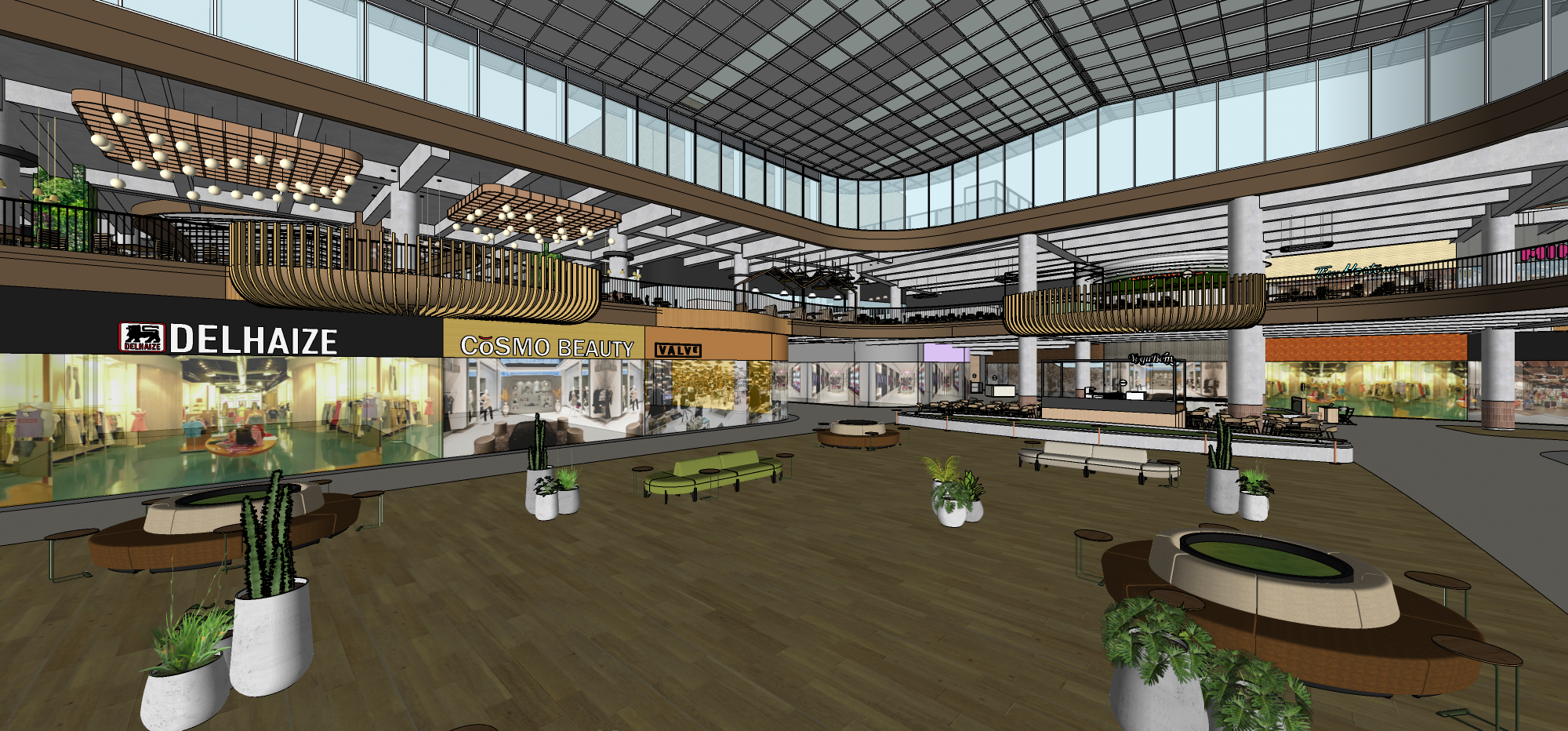 a modern shopping mall interior featuring a spacious and vibrant central plaza the flooring is crafted from wide wooden planks in a warm medium brown tone with a matte finish offering a natural and inviting base the ceiling is tall and expansive framed with elegant structural beams and fitted with large angled skylights that allow abundant natural light to pour in casting soft shadows and creating an open sunlit atmosphere lush green plants including tall indoor palms hanging foliage and potted tropical species are strategically placed along walkways and seating areas adding freshness and biophilic charm to the space the surrounding storefronts showcase sleek modern architecture with frameless glass windows and signage in clean white and brushed gold finishes subtly backlit with warm led lighting for a sophisticated yet approachable look scattered throughout the plaza are modern seating arrangements cushioned benches modular loungers and small caf tables with light oak or rattan finishes overhead pendant lights and track lighting complement the daylight shifting into a soft golden hue as evening approaches the overall ambiance is lively yet relaxed with a pleasant background of families strolling children laughing and subtle acoustic design that keeps the noise level comfortable the space feels upscale but inclusive a cool contemporary hub designed for community leisure and social connection