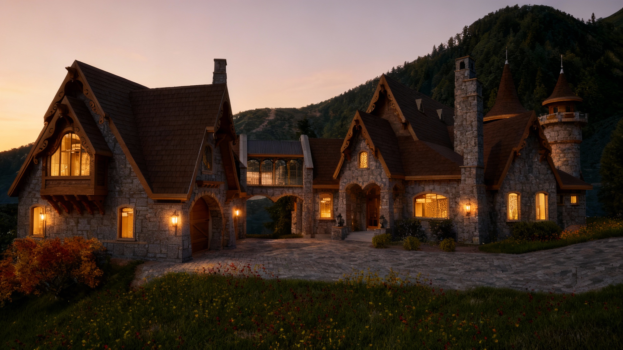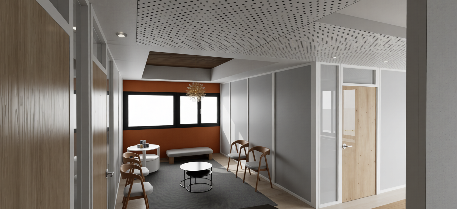 photorealistic architectural exterior render of the provided image preserving the existing building massing proportions and materials and elevating it to a high quality realistic visualization add landscaped grass areas with native planting low shrubs and ornamental grasses that are intentionally kept low and placed so they do not cover or obscure the building fa ade landscaping should frame the building and sidewalks while maintaining full visibility of all architectural features the background should consist entirely of mature trees forming a dense green tree line with no visible buildings beyond populate the scene with realistic people walking standing and talking along the sidewalk dressed in modern casual attire and scaled accurately to the architecture enhance the parking lot with clean realistic asphalt texture painted striping and parked cars in neutral modern colors the parking surface should appear well maintained with no tire marks or surface distressing use warm dusk or golden hour lighting with the sun positioned low in the sky to create a soft glowing atmosphere the building fa ade should be clearly illuminated with warm light showing material depth and texture while shadows remain soft and natural apply high resolution materials with accurate reflections roughness and depth include a realistic sky with warm tones balanced ambient light and subtle atmospheric depth render style ultra realistic professional architectural visualization dslr photography look cinematic warmth natural color balance realistic scale and proportions high detail sharp focus white backlit on signage