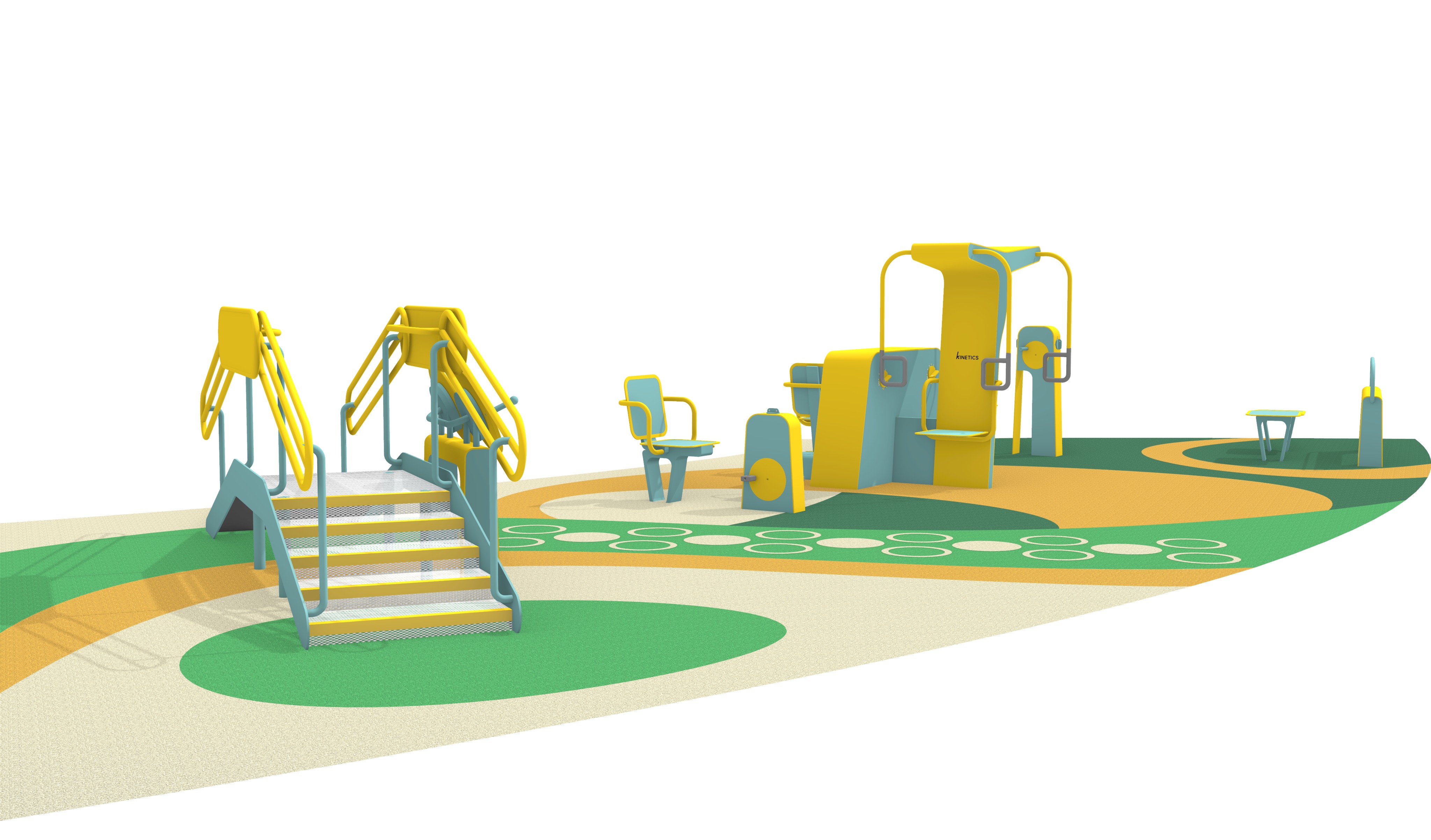 hyper realistic architectural render of a premium outdoor fitness area designed for a private upscale environment suitable for a luxury lifestyle or architectural magazine feature do not add any fitness equipment or flooring other than what is given visual foundation composition the overall composition and camera angle are inspired by high end urban resort and private club environments in singapore the fitness area is positioned within a secure well maintained open lawn clearly defined and organized with a balanced relationship between architecture greenery and open space a modern mid rise building forms the primary backdrop featuring clean contemporary architectural lines repetitive balconies with integrated greenery vertical and horizontal planting that softens the fa ade a refined institutional yet luxurious character the building frames the scene without overpowering the fitness area outdoor environment surroundings the setting is clearly outdoors surrounded by lush manicured landscaping including mature trees and layered shrubs along the perimeter green buffer zones that create privacy and comfort a neat boundary fence that subtly separates the fitness zone from adjacent areas the ground treatment around the fitness area consists of well kept grass and appropriate outdoor safety surfacing blending naturally into the surrounding lawn and landscape paths and circulation zones are minimal clean and unobtrusive reinforcing a calm premium atmosphere rather than a public park feel vibe lighting activity lighting represents a bright daytime scene with warm directional sunlight coming from the side creating soft natural shadows rich material highlights no harsh or dramatic contrast the atmosphere is active yet refined adults of diverse backgrounds are using the fitness equipment naturally movements feel candid and realistic not staged the overall mood is calm healthy and exclusive reflecting a private club or residential wellness environment materials realism all materials are rendered in 4k uhd hyper realism including metal fitness equipment safety flooring and grass textures building fa ade finishes railings fences and foliage textures should feel tactile premium and true to life with careful attention to scale and detail output quality the final image must be clean and free of watermarks highly polished and aspirational clearly representative of a private outdoor fitness environment not a public hdb or playground setting all material flooring bright yellow dark green apple green cream is epdm flooring for the texture stone make light grey clean