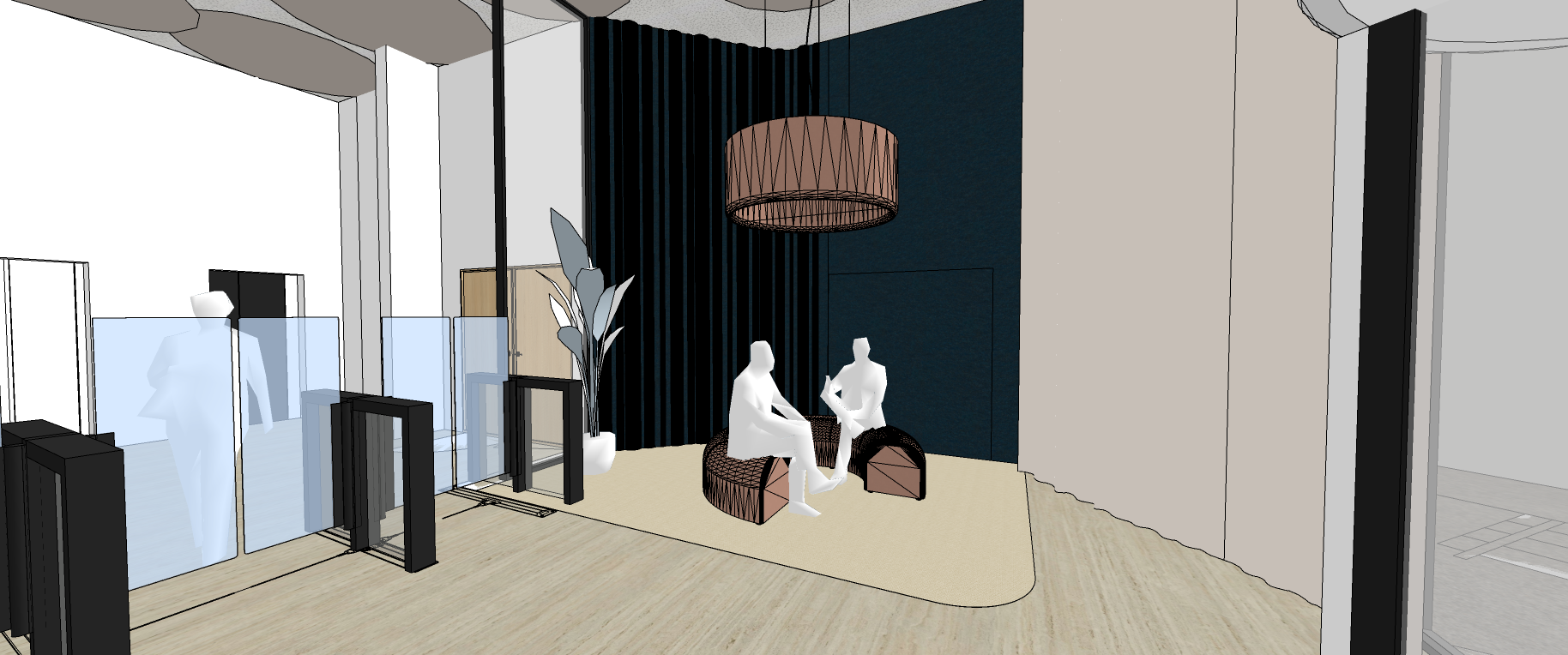 create a modern elegant interior scene featuring a cozy seating area the room has a sophisticated atmosphere with a mix of dark and light tones the walls are deep navy blue providing a refined contrast the floor is a light mortex with beige carper enhancing warmth illuminate the scene with soft ambient lighting emphasizing a sleek modern rounded ceiling light fixture in pink textiel include two young human figures in positioned at a chic round textile pink sofa glass partitions contribute to an open yet intimate feel and sheer vertical blinds in neutral tones add texture to the large windows overall mood contemporary stylish and inviting