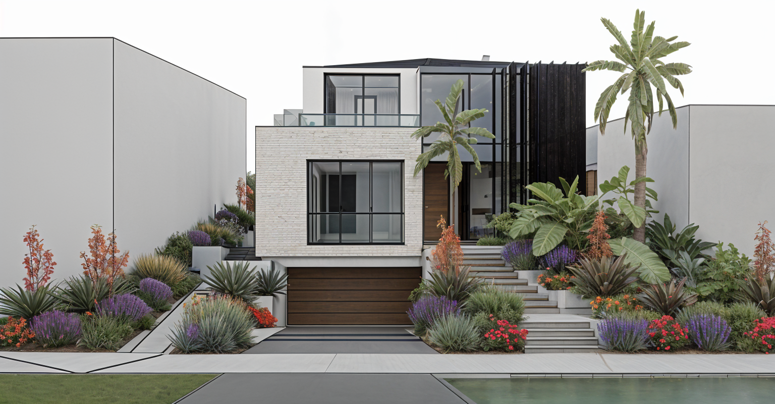 a manicured lawn layered flower beds low maintenance shrubs native plants stone pathway leading to the entrance