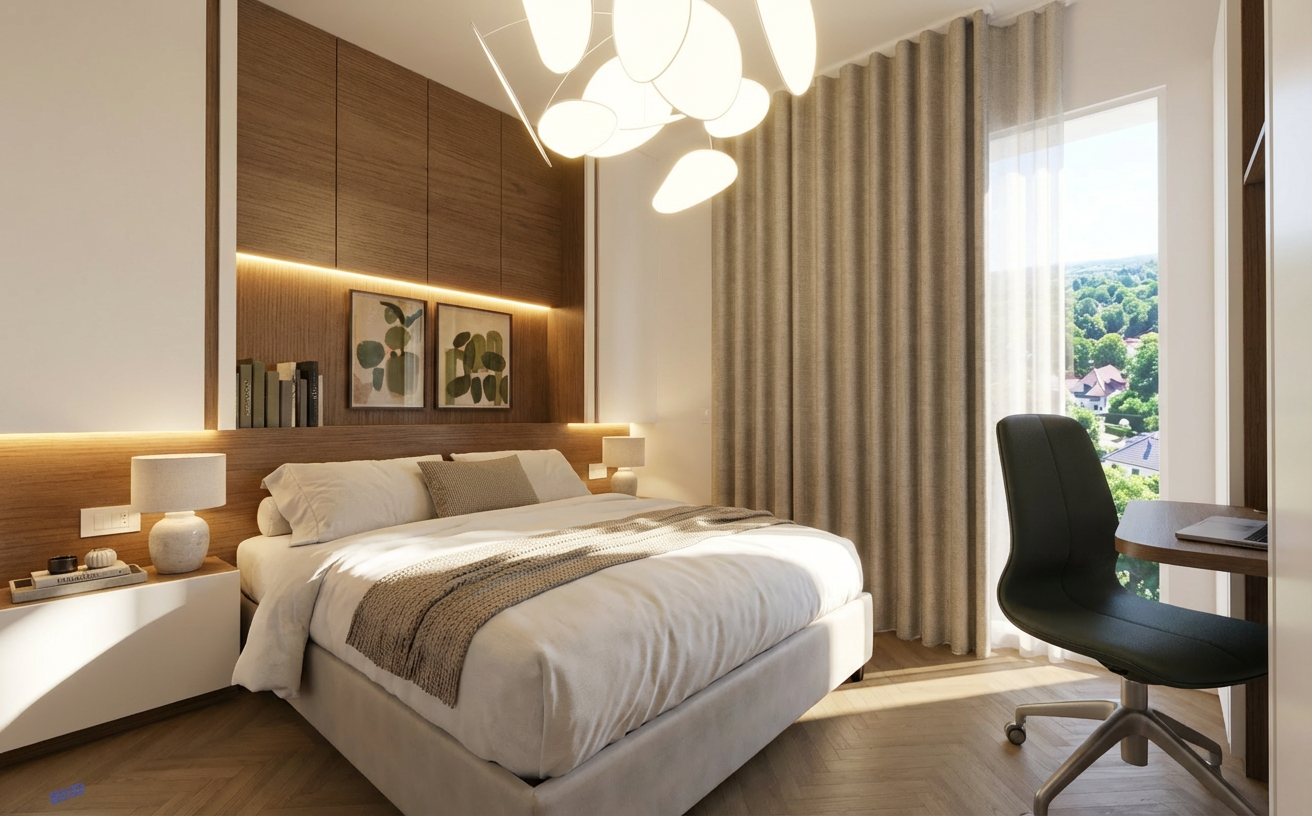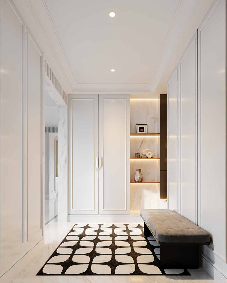 a modern and elegant atrium lobby featuring large glass windows with black frames allowing natural light to flood the space the flooring is a polished light gray marble creating a sleek and sophisticated atmosphere a contemporary reception desk in front made of light wood with a dark marble countertop the walls are adorned with dark gray wood paneling the furniture includes plush brown sofas arranged in welcoming seating areas lush green plants in stylish black pots are placed strategically adding a touch of nature the overall atmosphere is professional and inviting with soft ambient lighting creating a warm and welcoming feel