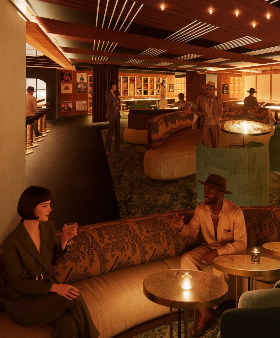 moodly warm lighting club with bar and furniture accent color blush at night soft curtains velvet curtain on the ceiling