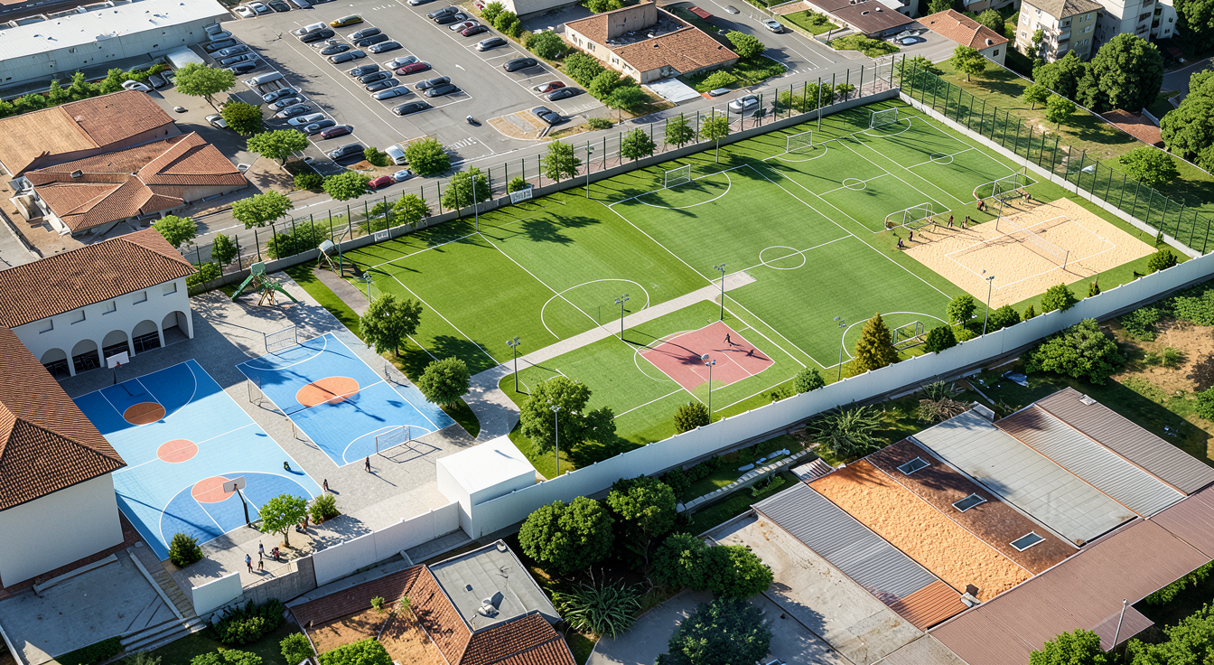 ultra realistic aerial masterplan of a contemporary sports complex integrated into an urban neighborhood orthographic bird s eye view similar to google earth satellite imagery the layout shows multiple perfectly readable sports fields green soccer pitches with crisp white markings center circle penalty areas goals colorful basketball courts with precise painted lines and hoops and beach volleyball courts with bright white sand and nets fields arranged in a clear geometric grid for urban planning readability surrounding context includes residential blocks streets with cars parking areas tree lined pedestrian paths small spectator stands lighting towers and minimal service buildings realistic city textures accurate urban scale sharp field markings balanced contrast global illumination soft daylight shadows architectural competition masterplan quality ultra detailed 8k resolution professional drone satellite visualization