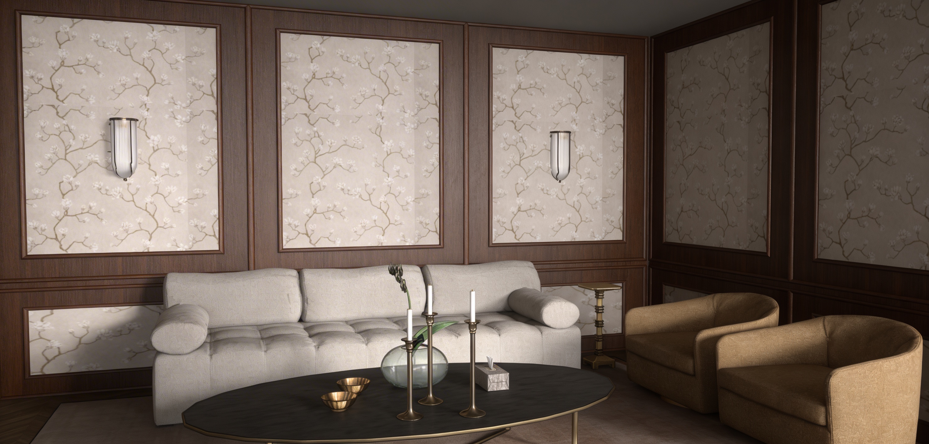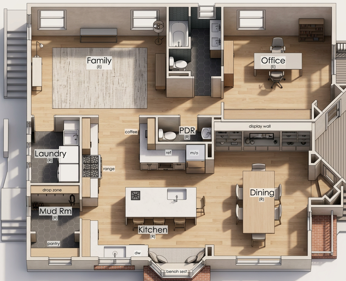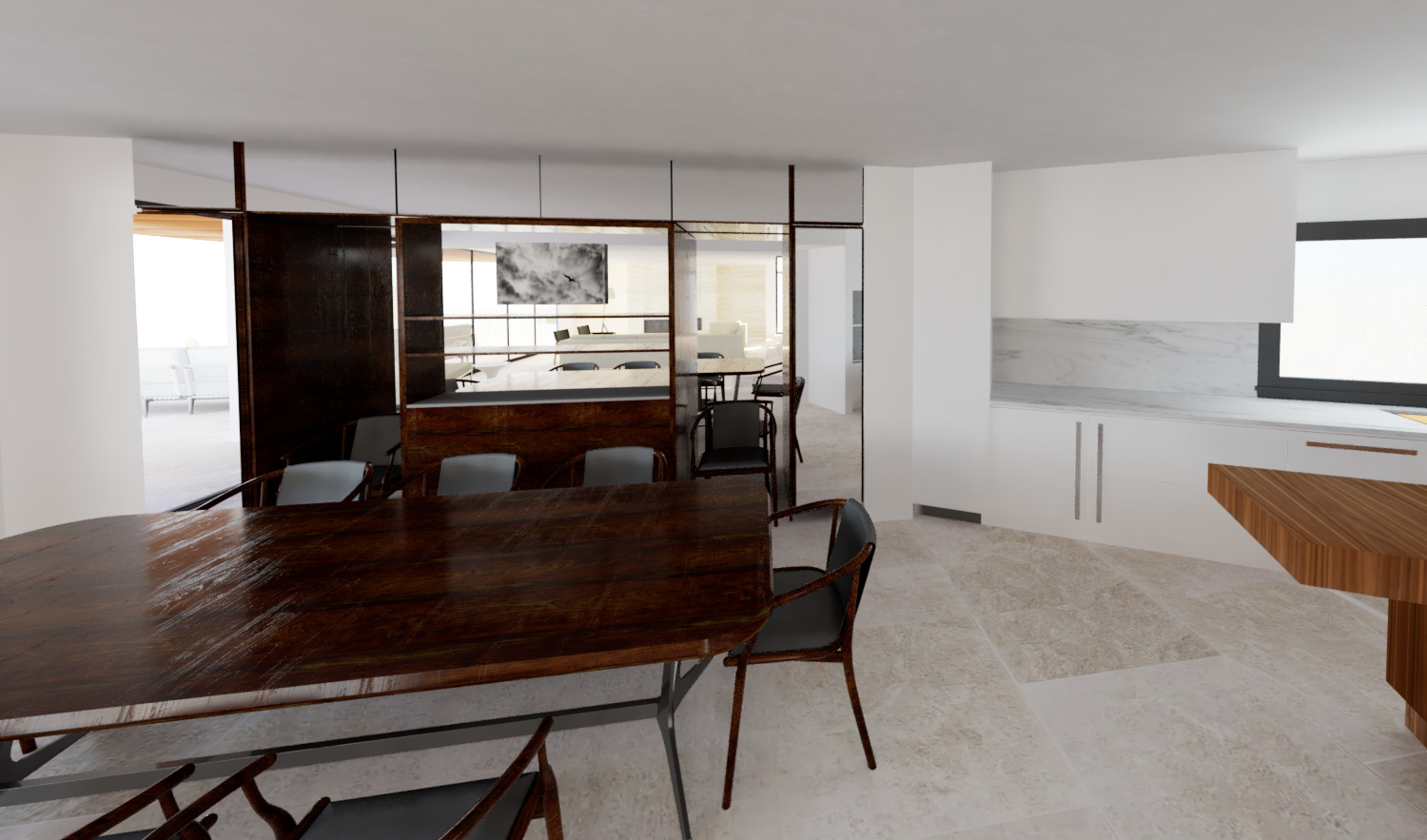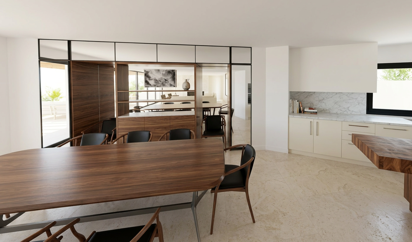 create a modern dining room and kitchen room featuring a spacious walnut table surrounded by elegant walnut chairs with black leather cushions the atmosphere is warm and inviting enhanced by rich walnut and glass cabinetry incorporate white walls and a light marble backsplash in the kitchen the kitchen cabinets are an ivory finish and color add a large window with black frames to allow natural light to flood in creating a bright airy feel the floor is light stone tile complementing the neutral palette