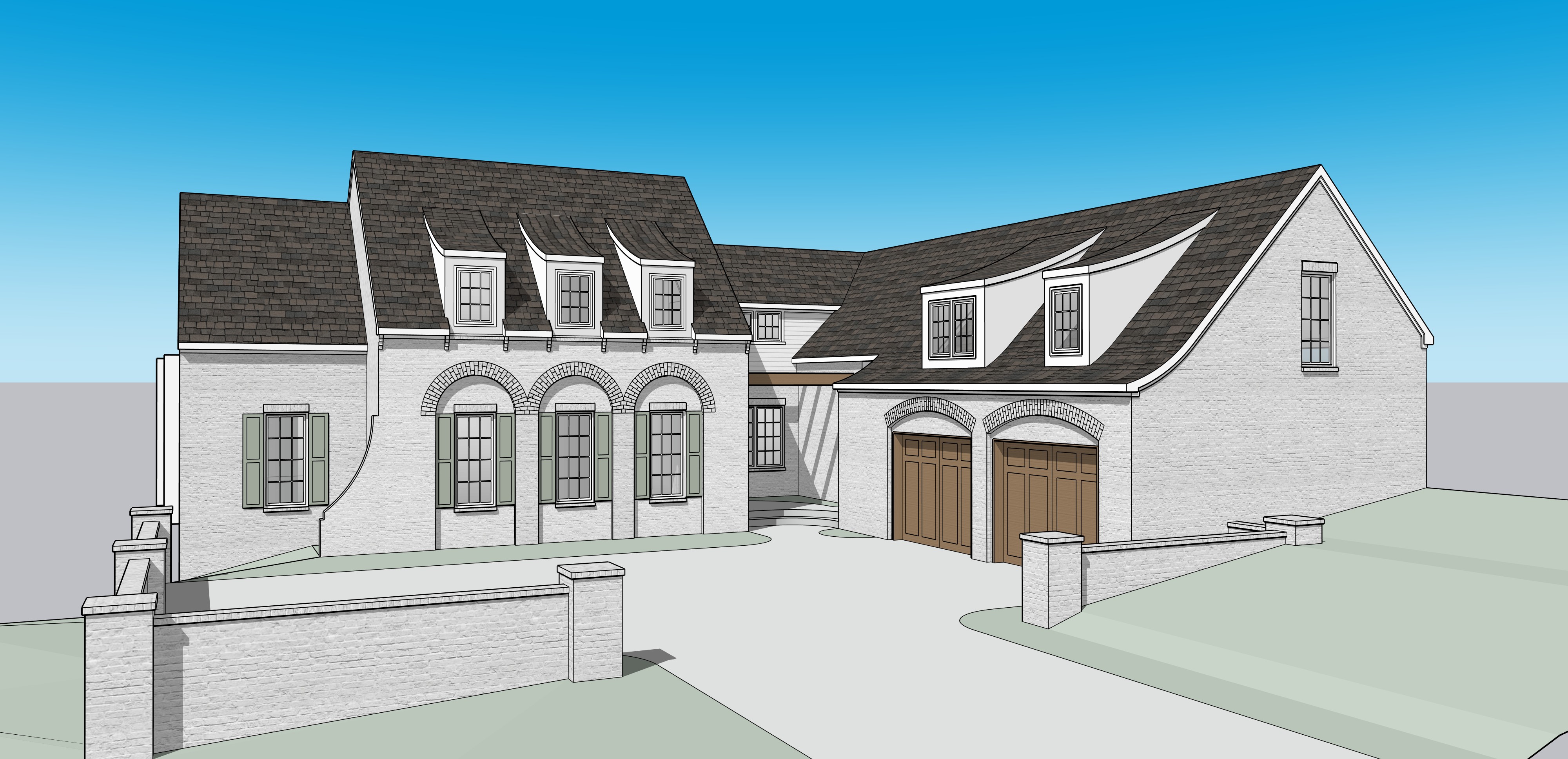 afternoon lighting large oak and maple trees in background white brick house with white windows maintain all window and door openings and colors maintain shutters only where shown