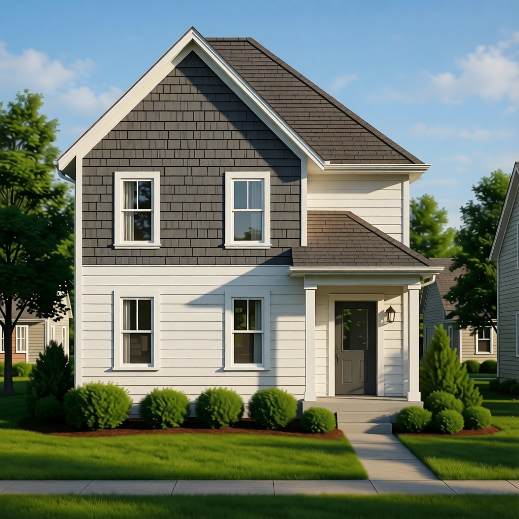 keep everything the same but change the shakes color to dark gray siding to light gray and front door to grayish green color