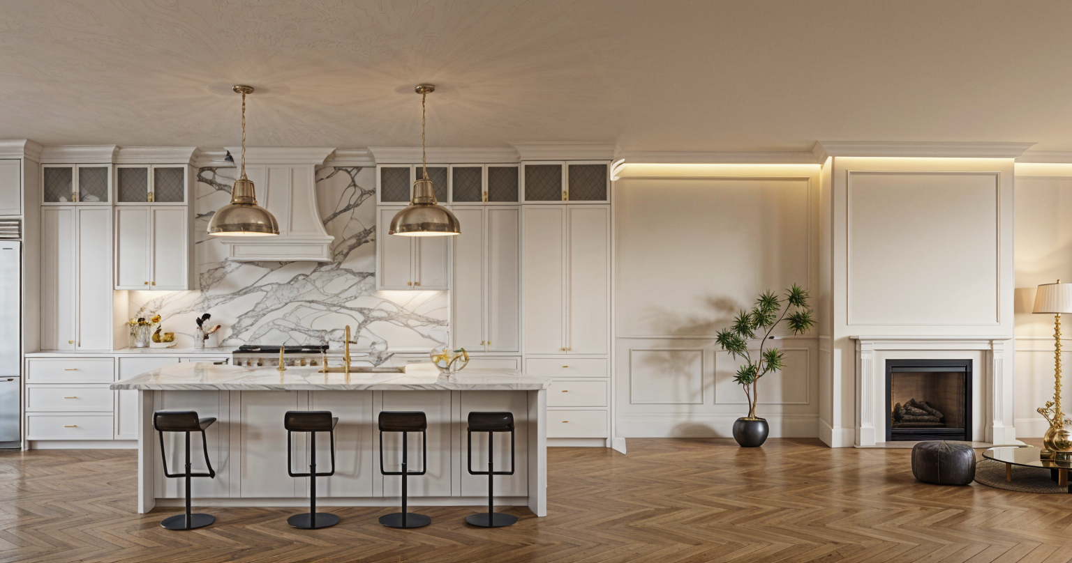 a modern minimalist interior with soft natural lighting the floors and walls are pure white providing a clean and open look wood windows allow ample sunlight to fill the room reflecting off the glossy surfaces the wood furniture set includes sleek chairs and a table coupled with a dark wooden coffee table for contrast add touches of greenery with small plants in white pots for a refreshing feel sky outside is a clear blue with soft clouds visible through the windows the atmosphere is serene and peaceful exuding simplicity and elegance