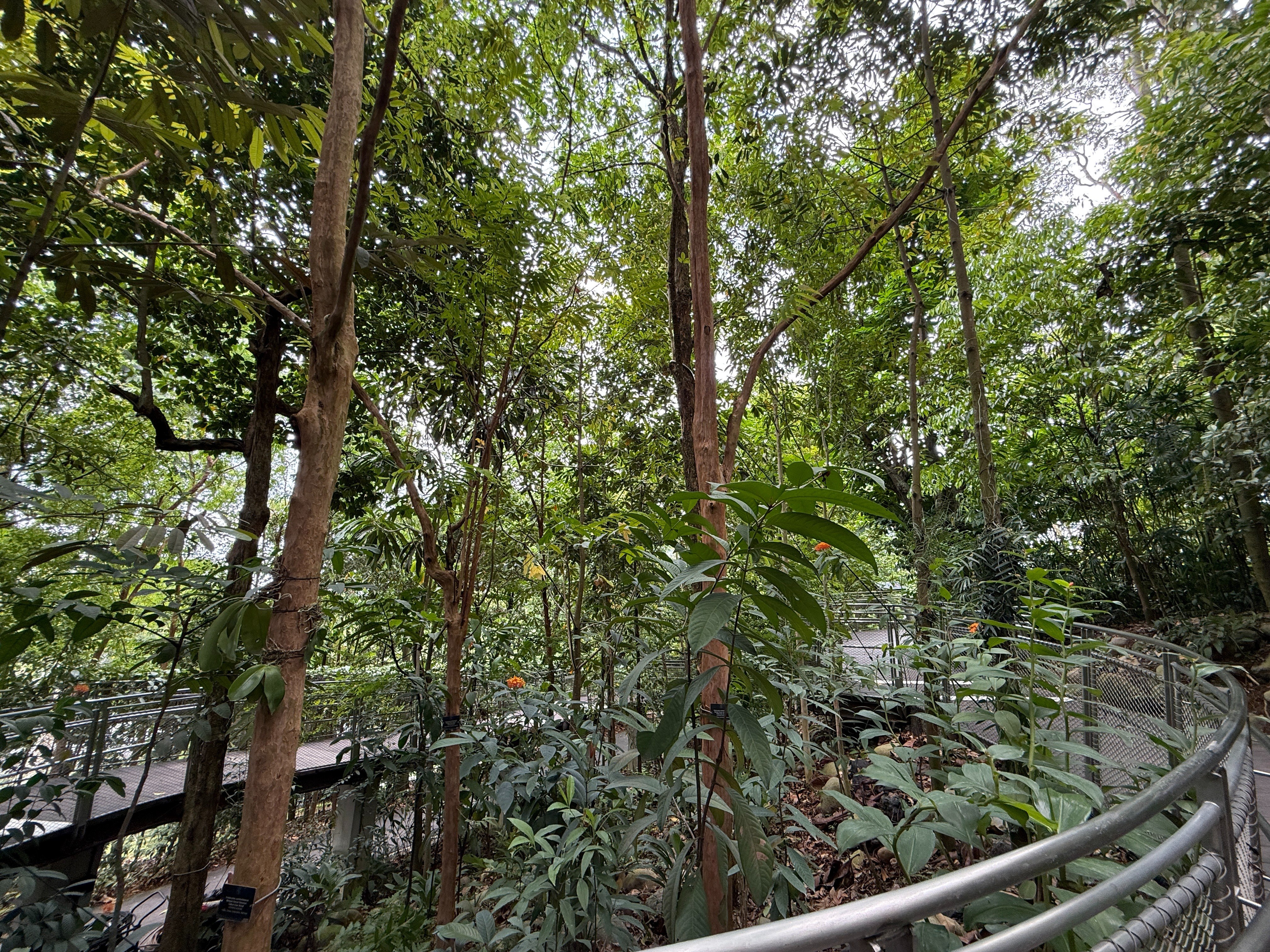 a render of a night installation at the singapore national orchid gardens tall light rods stick up from the ground at angles and at some points are disjointed more rods sit amongst the trees the light up in bright white pulses like a lightning strike the rods glow brightly along the right path people walk through holding oil lamp lanterns