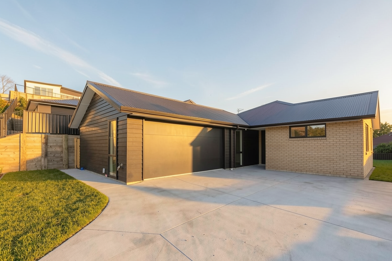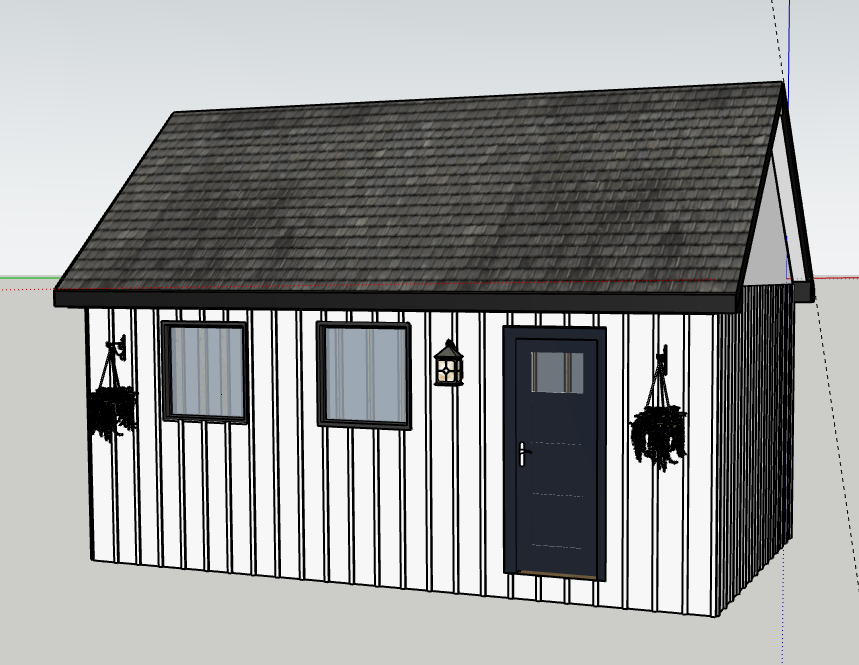 a small charming wooden cabin with vertical white siding and black trim the roof is covered in dark gray shingles two windows with light blue glass are centered on the front alongside a dark gray door featuring a small glass panel a rustic lantern in bronze hangs near the door on either side of the windows lush green hanging plants add a touch of nature the atmosphere is calm and serene set during a bright clear day with a soft blue sky