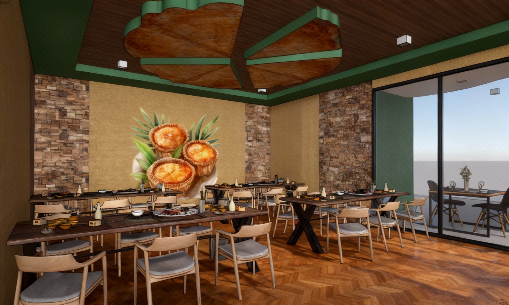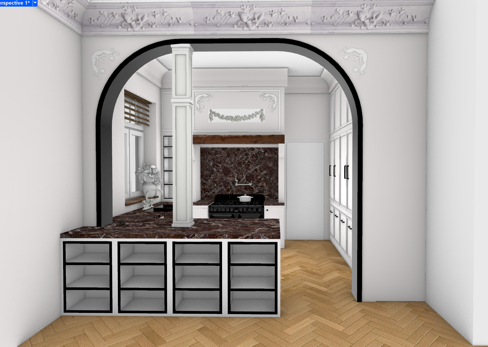 kitchen with molding on the ceeling stone materials lightning in the glassed cupboards