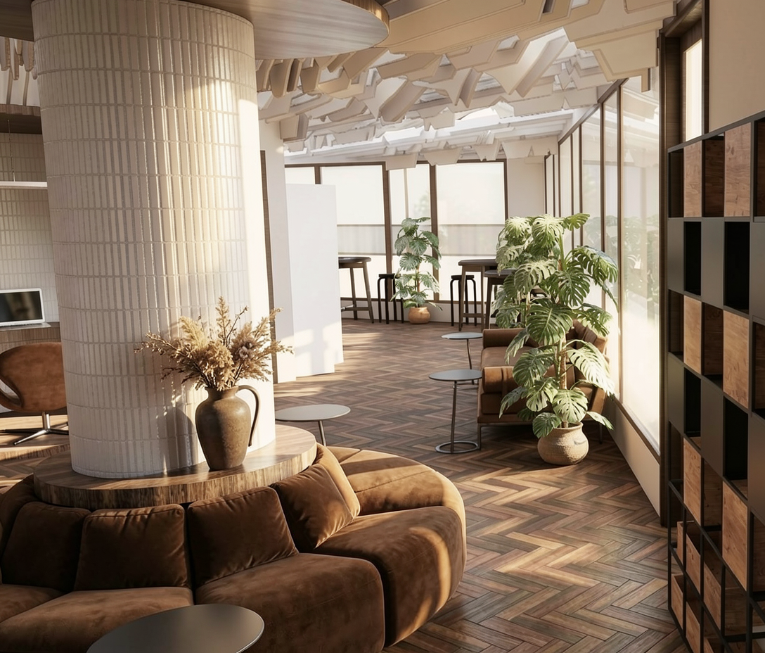 maintain everything the same maintain all geometry colors furniture placement lighting camera angle and textures only replace the two arm chairs with the cb2 torino accent chair dark brown finished beech flows the graceful frame with arms that curve and angle into back legs and front legs that anchor the plush seat cushion tight tailored to hug every curve the beige upholstery mixes yarns to create a textured hand and the look of a handwoven textile an extra thick seat and a backrest that wraps over the arms