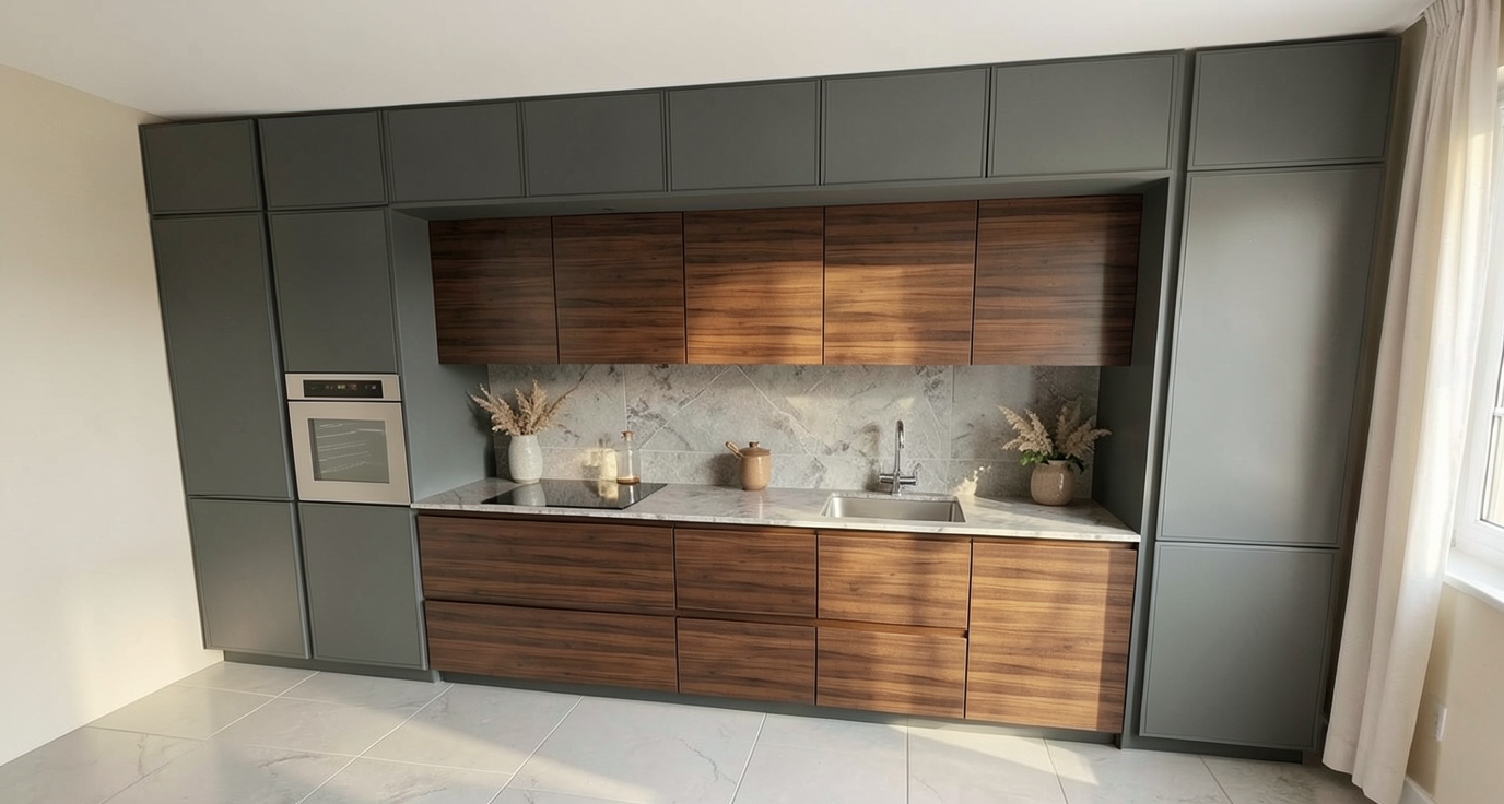 create a modern interior room with a minimalist design the walls are a soft beige color with a painting on the central partition wall the ceiling and remaining walls are painted in a sleek light creame paint the floor is a very light gray marble viening large format tiles polished finish a circular decorative feature with led cove light inside rests on a floating shelf on the wall which is covered by polished glossy beige stone slab add a pendant light with a frosted glass shade casting a warm glow the dining area features a dark wood table with off white upholstered chairs the atmosphere is warm and inviting with gentle lighting accentuating the clean lines and modern furnishings the back wall pantry in a limewash taupe color with the black polished marble tabletop and backsplash add downlights on ceiling the door to be dark frosted leads to kitchen brighter downlights right side wall to be plain white cabinet doors there is no gap between door and pantry unit remove the black rectangle on the middle wall