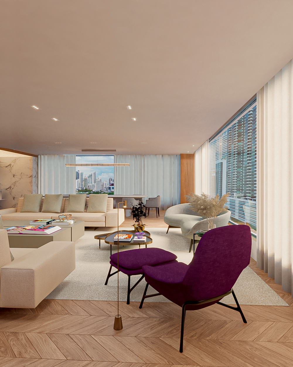 enhance realism of this interior render without changing the architecture furniture materials layout colors or composition keep the same camera angle improve natural daylight to create a sunny daytime atmosphere with soft natural shadows increase material detail realistic fabric texture on upholstery natural wood grain on the herringbone floor subtle reflections and veins on the marble surfaces and soft ambient occlusion in corners maintain a clean elegant contemporary aesthetic