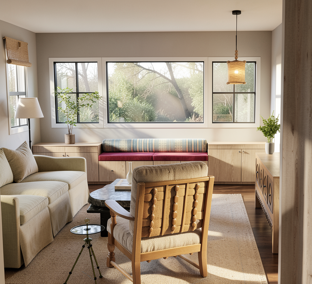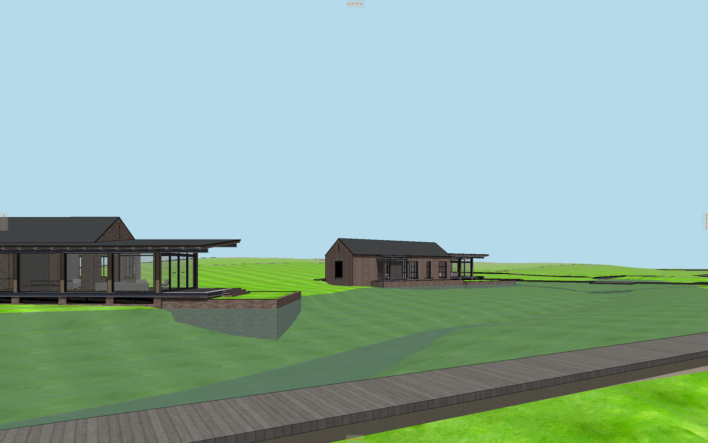 detail shot of an antique brick house with a soldier course at the top of brick walls with timber columns steel beams reclaimed pine soffit yellow pine trees in the background clouds in the sky lake inlet in the foreground landscape to be tall wild louisiana grasses a large group of people swimming in the water people on kayaks