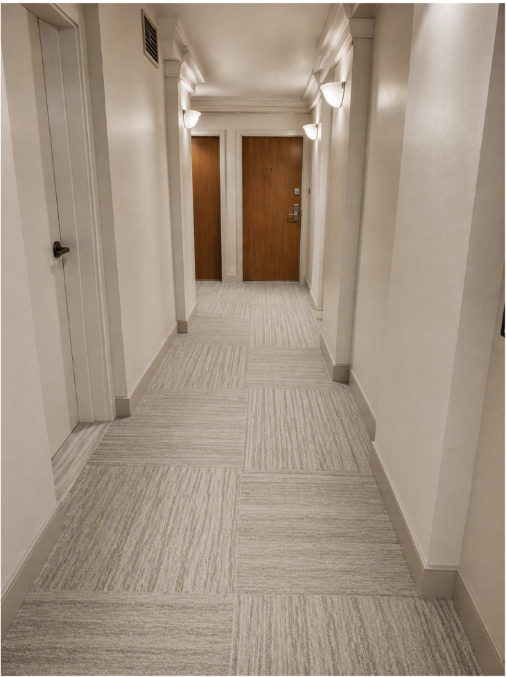 enhance the lighting by replacing the existing wall sconces with more modern minimal fixtures in the exact same locations the new sconces should have a clean contemporary architectural design be slim and understated with no decorative detailing be finished in a refined neutral material such as brushed nickel soft bronze or matte black emit a warm soft even light consistent with high end residential interiors replace the existing flooring with a high end luxury vinyl tile lvt suitable for a contemporary residential condo corridor the flooring should be in a warm greige to soft taupe tone avoid cool or muddy greys be inspired by refined limestone or soft stone finishes include subtle natural tonal variation to add depth and richness have a crisp well defined surface not blurry or overly uniform be completely matte with no sheen or reflectivity install the flooring in a large format tile layout with clean precise joints to create a structured and intentional appearance the overall effect should feel elevated and architectural calm sophisticated and contemporary consistent with high end new build residential interiors nyc style avoid terrazzo or speckled patterns visible repetition high contrast veining overly flat or generic finishes anything that reads as institutional or commercial do not modify any existing finishes materials colours doors trim thresholds or architectural elements only update the light fixtures and flooring