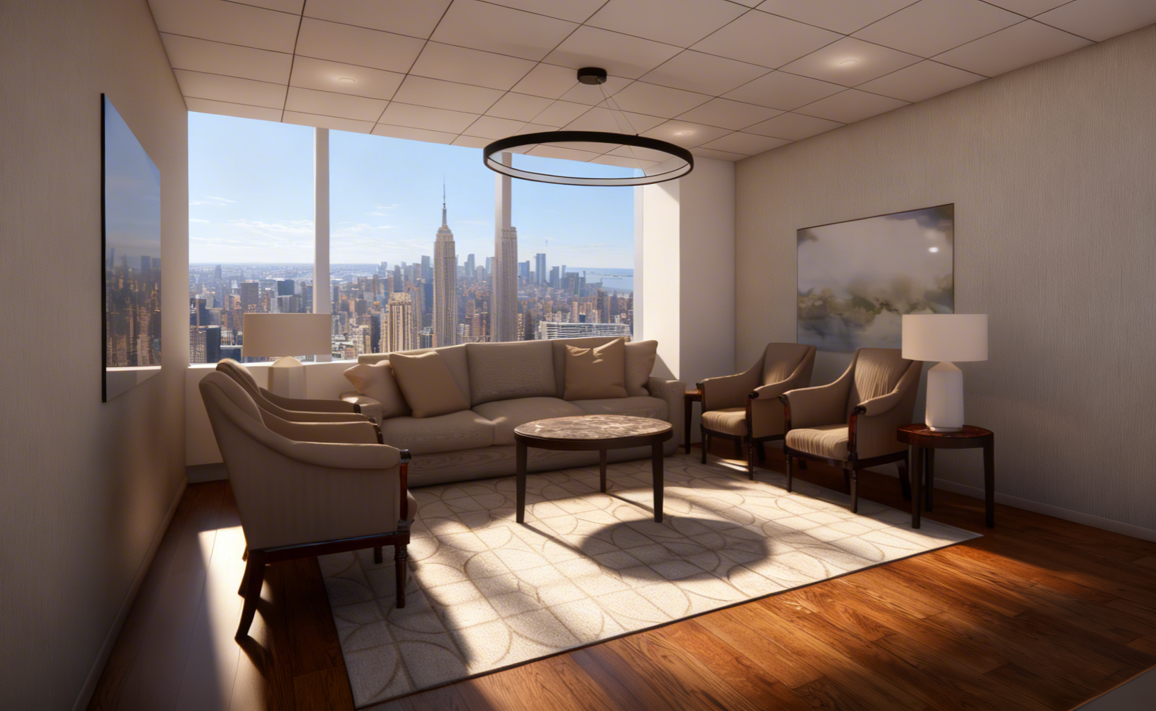add views of midtown manhattan from 43rd floor keep all the elements and finishes as they are provide photo realistic rendering in daylight