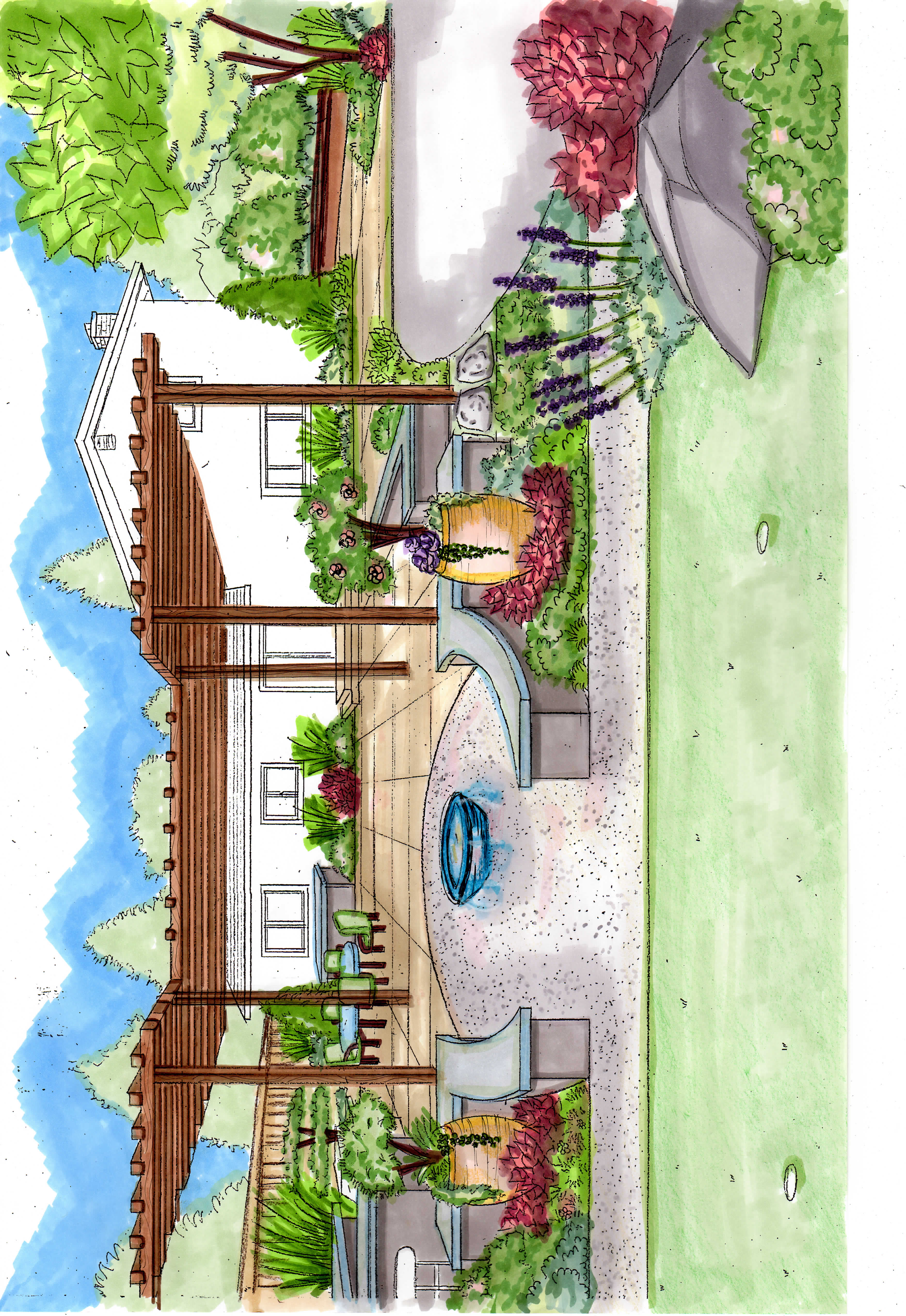 turn this hand sketch into a beautiful 3d realistic photo quality image of a landscape the pergola is a dark grey modern louvre pergola the seatwalls are smooth stucco with poured in place concrete cap that is a stained turquoise color and the patio space is stained concrete with score joint pattern in the center of the photo is a low bowl water feature spilling into crushed gravel there is a pot just to the right of the gravel patio with grass in the fore ground the plants are mediterranean style low water